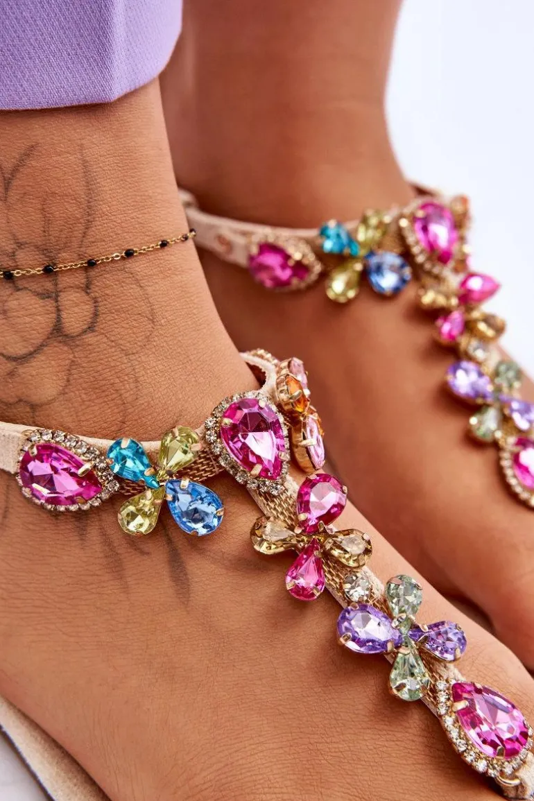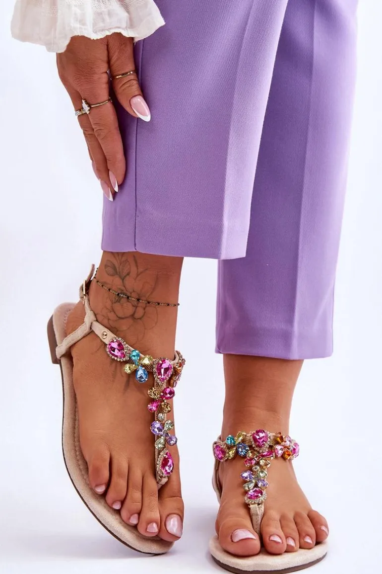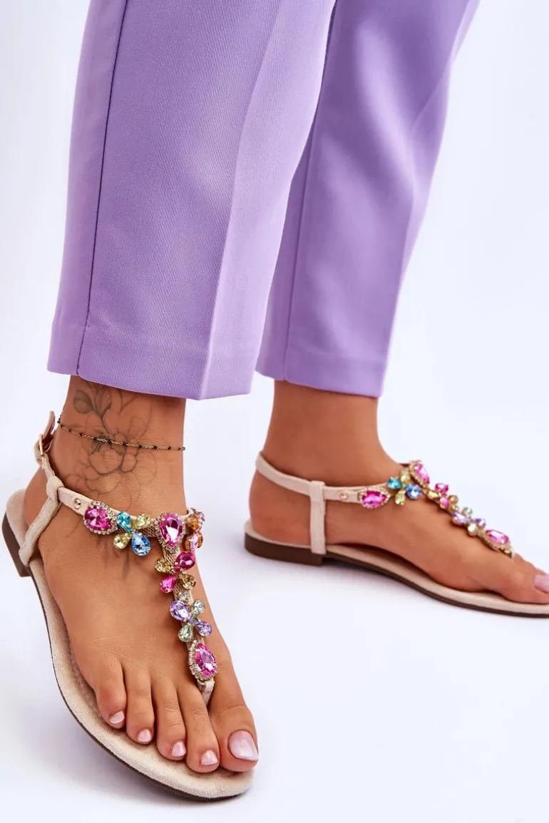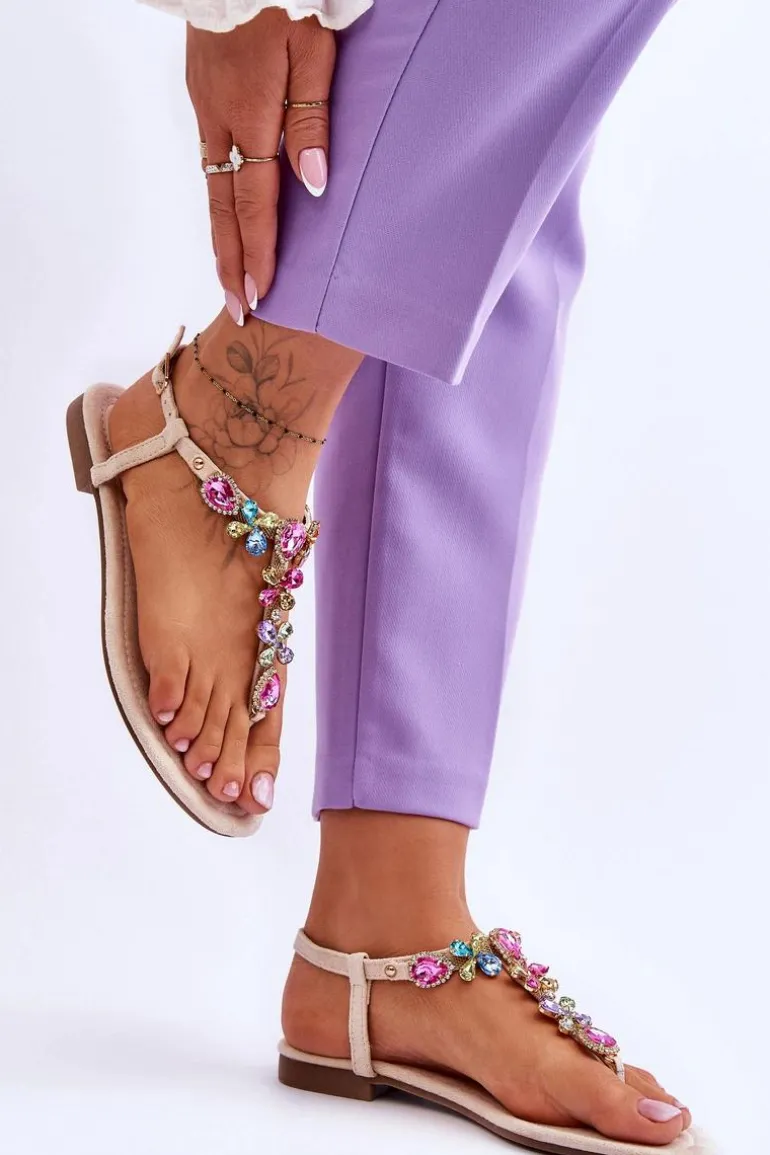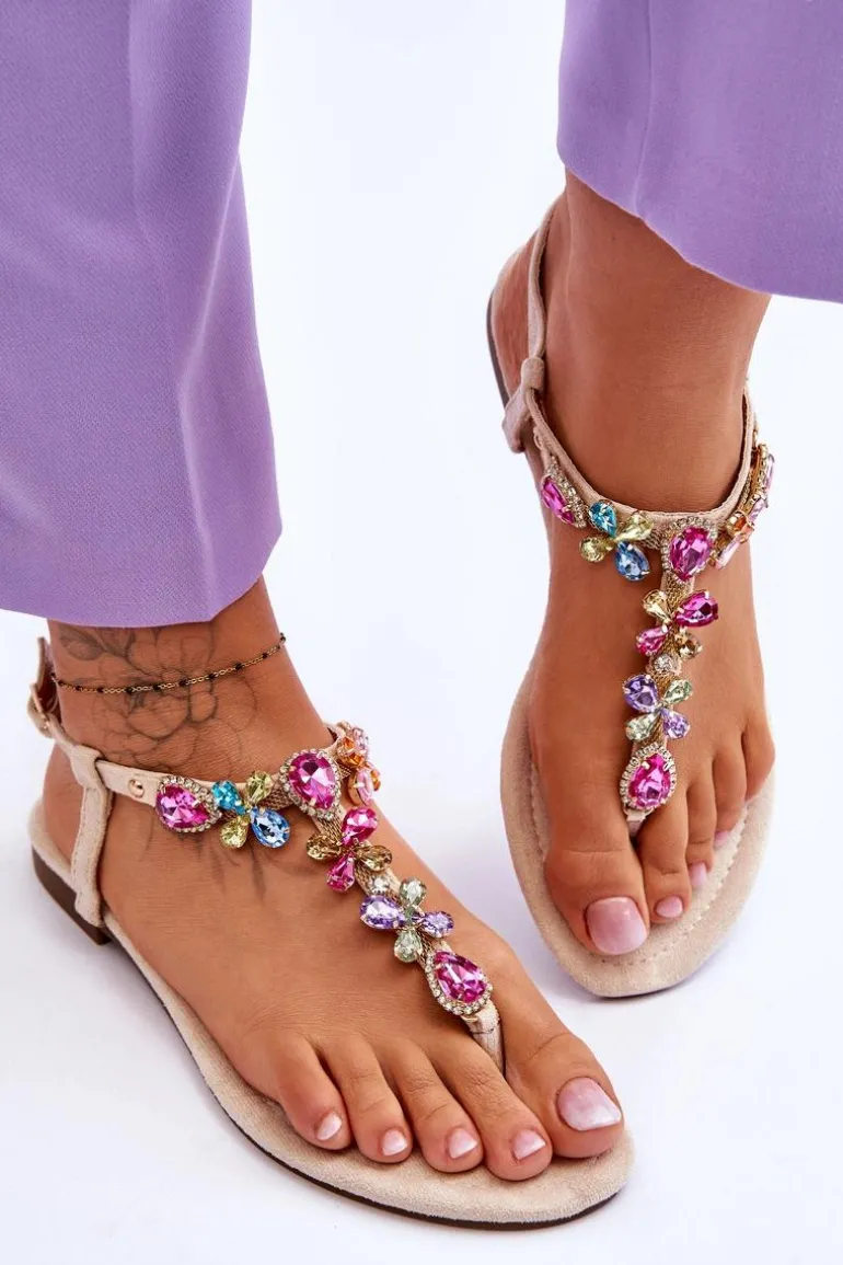 Zamszowe Sandały Japonki Z Kamieniami Beżowe Frency