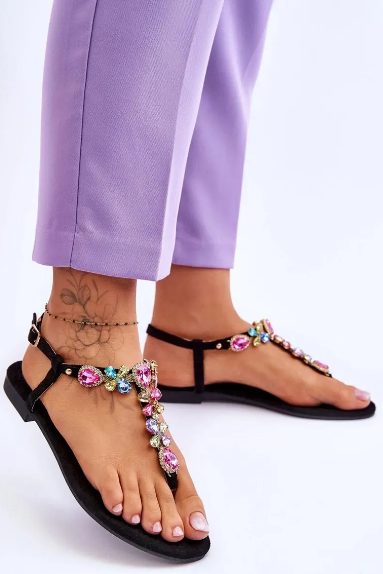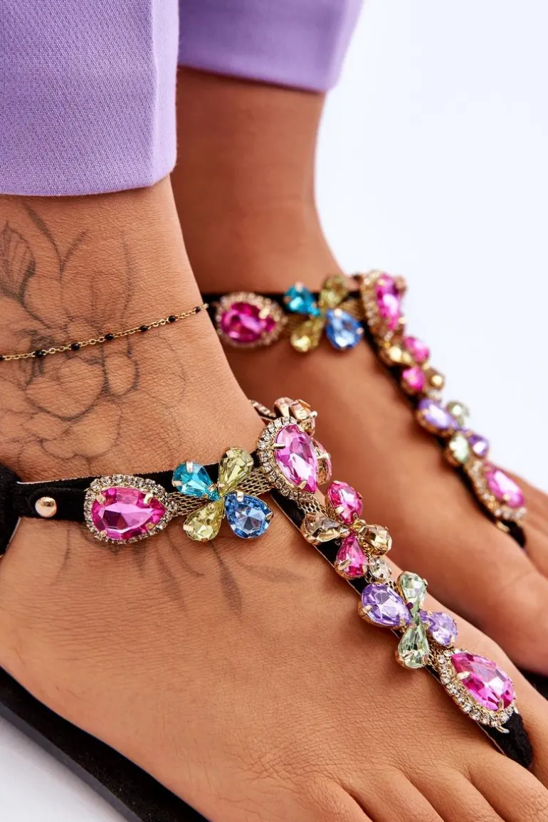 Zamszowe Sandały Japonki Z Kamieniami Czarne Frency