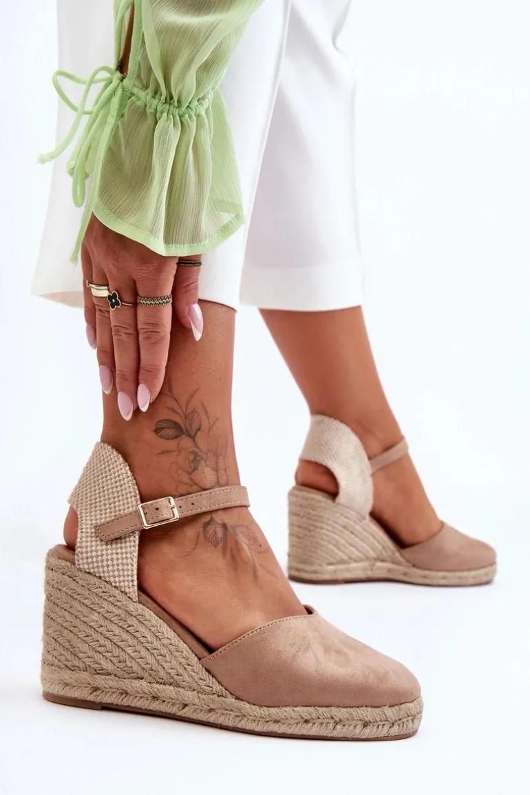Modne sandały damskie zostały wykonane z połączenia eko zamszu oraz tkaniny. Sandałki te posiadają zapinanie w postaci regulowanego paska. Koturn i platforma zostały ozdobione jutową plecionką. Podeszwa w tych butach jest gumowa i antypoślizgowa. Miękka wkładka zadba o Twój komfort i wygodę. Przy wyborze rozmiaru prosimy sugerować się tabelą rozmiarów.