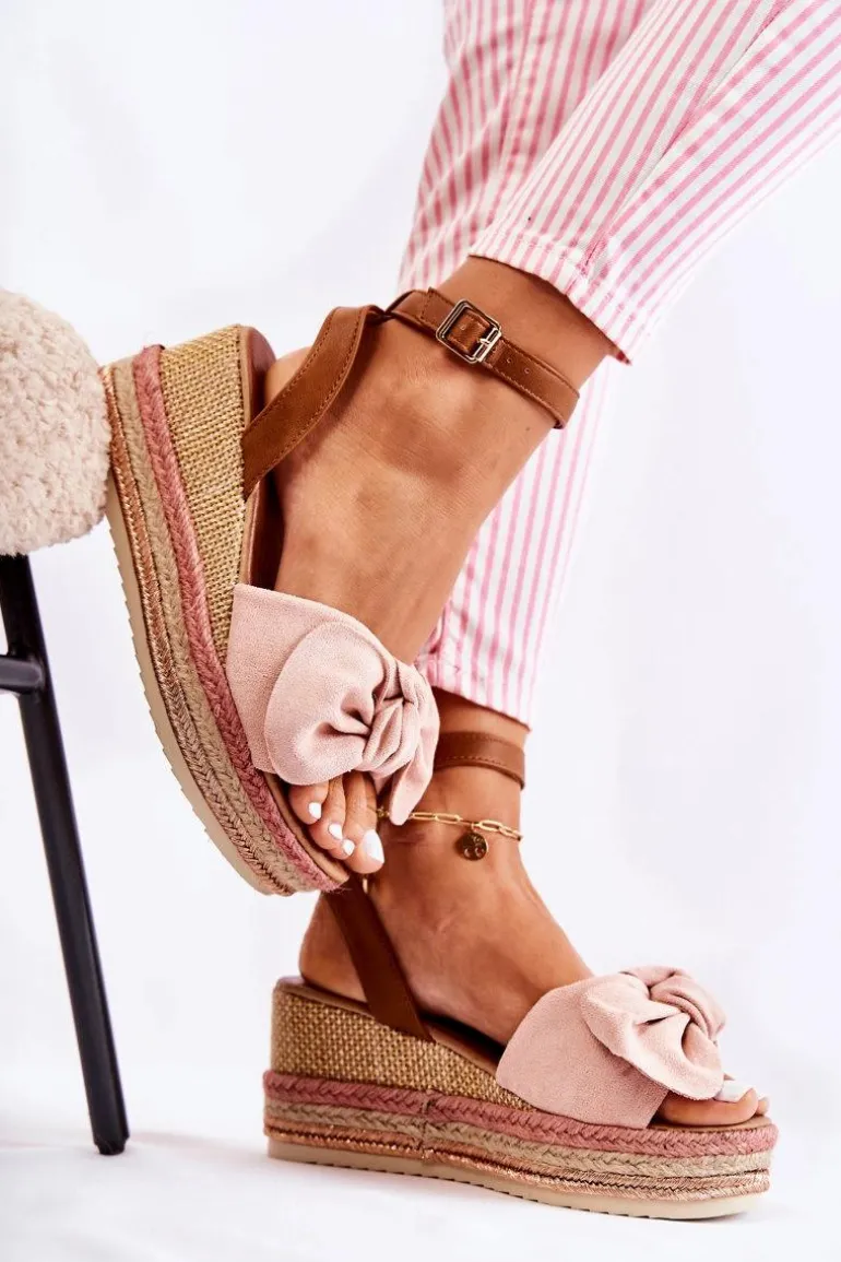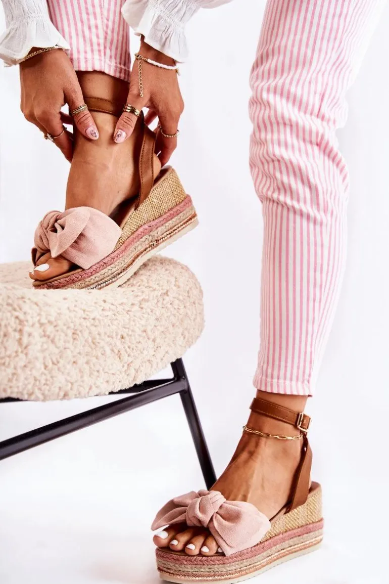Sandały damskie wykonane z eko zamszu. Regulowane zapinanie ze sprzączką. Głównym elementem zdobienia jest piękna kokarda z eko zamszu. Koturn posiada trzy kolorowe, plecione paski. Podeszwa jest gumowa i antypoślizgowa. Eko skórzana wkładka zadba o Twój komfort i wygodę. Sandały świetnie sprawdzą się w letnich stylizacjach. Przy wyborze rozmiaru prosimy sugerować się tabelą rozmiarów.
