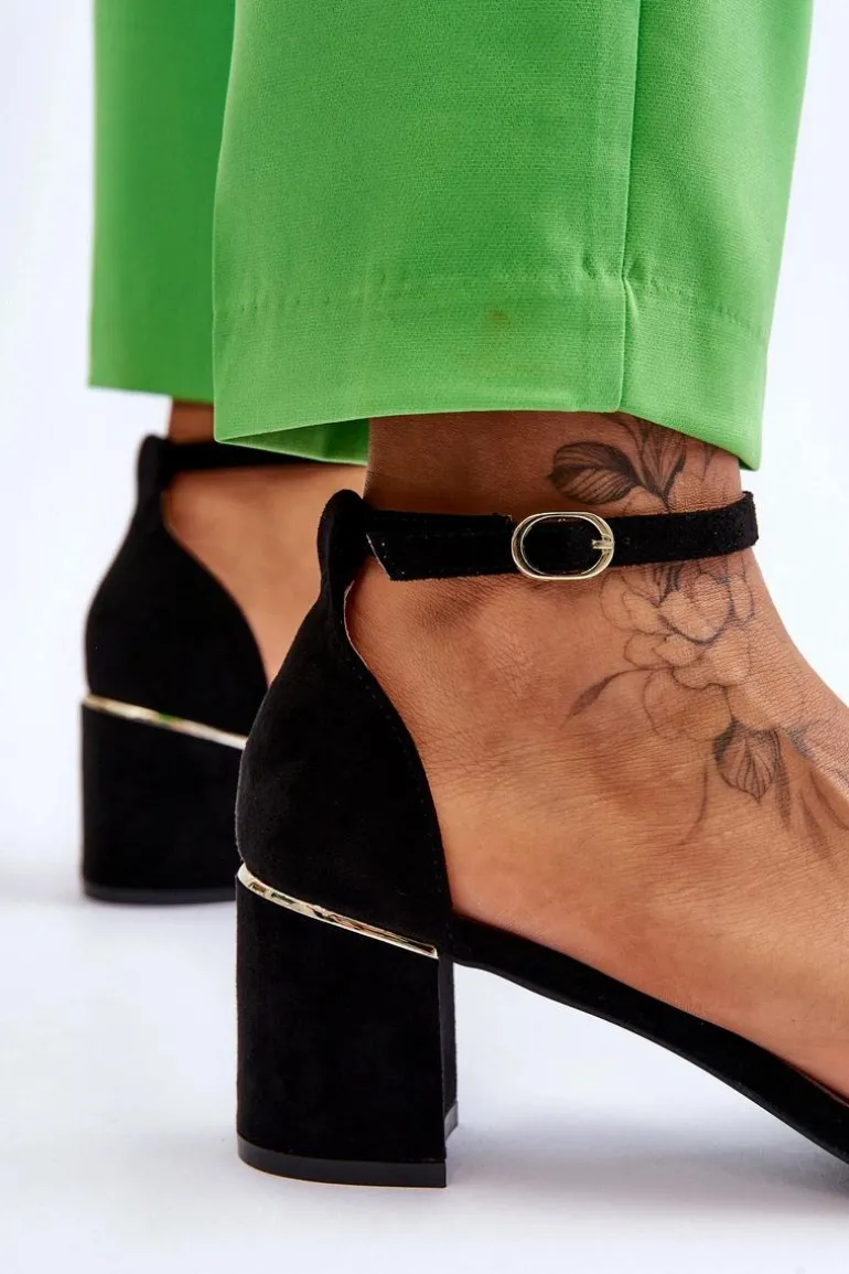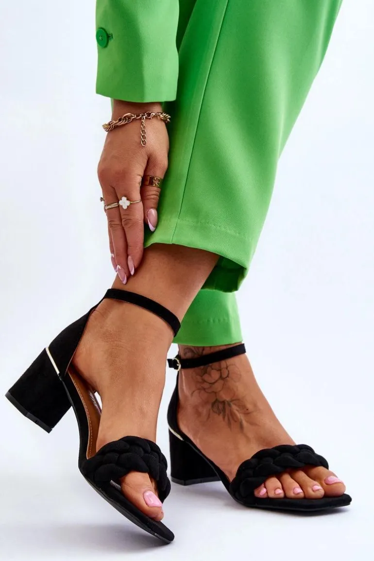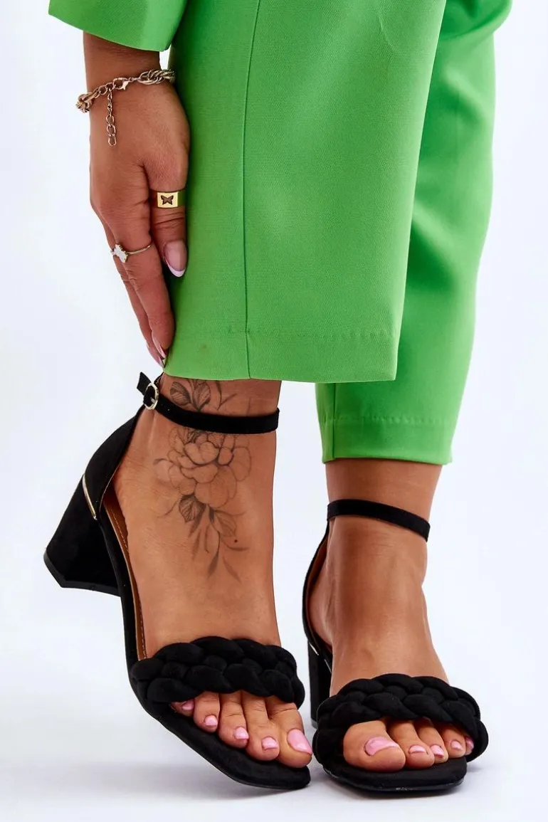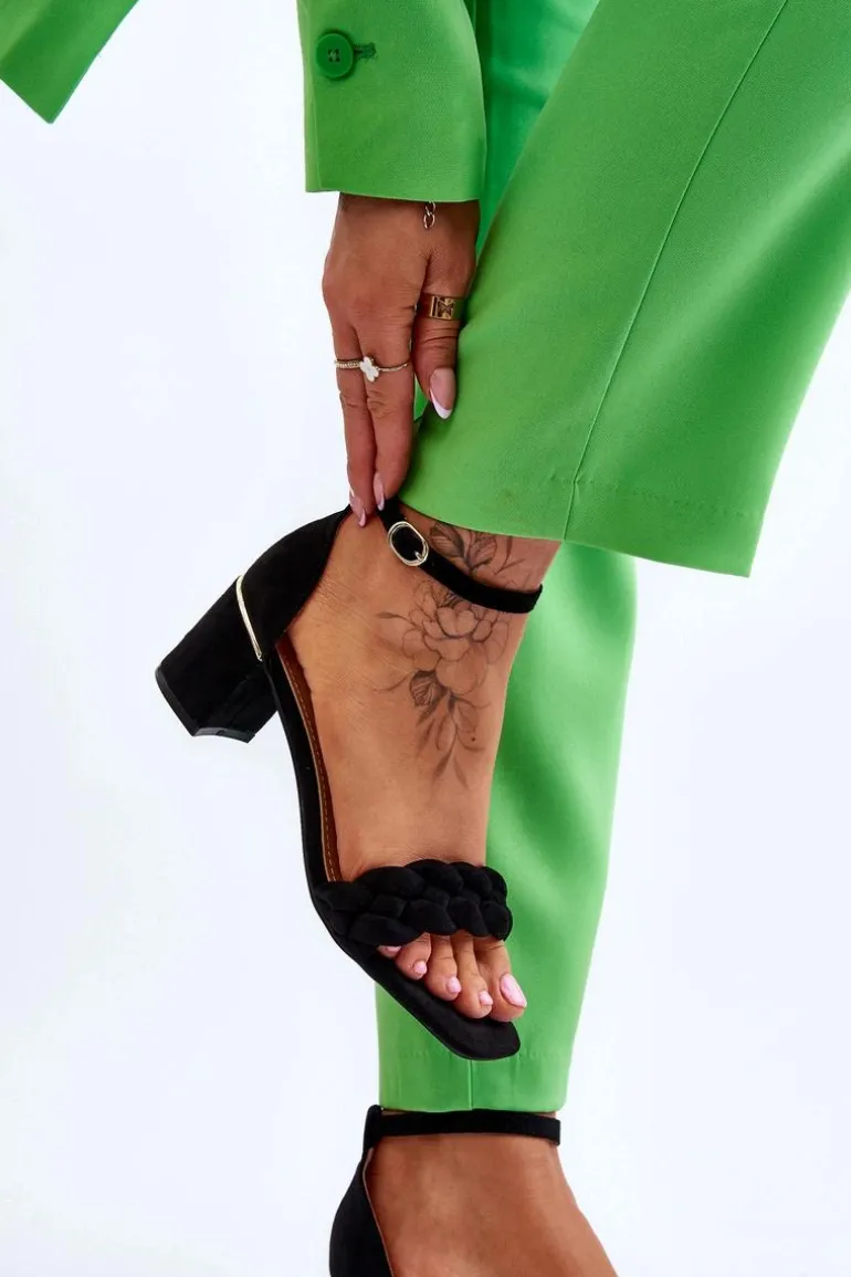Eleganckie sandały damskie zostały osadzone na obcasie w postaci słupka. Wykonane z miłego w dotyku eko zamszu. Posiadają ozdobny pasek w formie warkocza na przodzie obuwia. Zapinane wokół kostki na sprzączkę z regulowanym paskiem. Miękka wkładka z eko skóry oraz wygodny obcas zapewnią komfort podczas użytkowania. Świetnie sprawdzą się na spotkania biznesowe, uroczystości rodzinne czy romantyczny spacer. Przy wyborze rozmiaru prosimy sugerować się tabelą rozmiarów.
