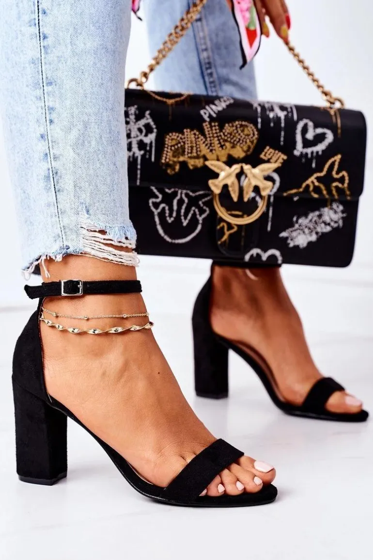 Eleganckie sandały na słupku wykonane z eko zamszu. Miękka wkładka z eko skóry oraz wygodny obcas zapewnią komfort. Przy wyborze rozmiaru prosimy sugerować się tabelą rozmiarów.
