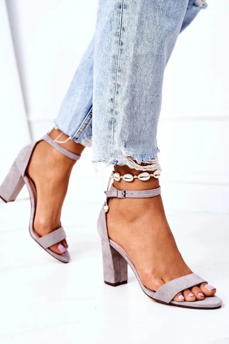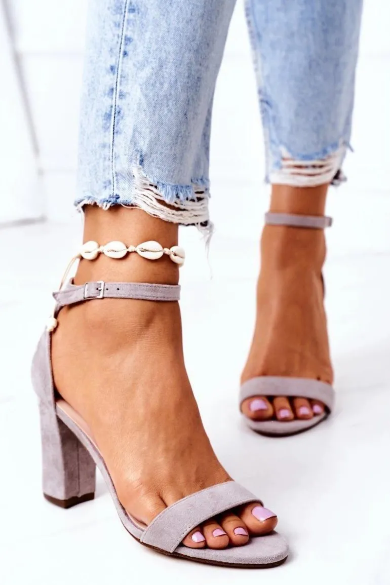 Eleganckie sandały na słupku wykonane z eko zamszu. Miękka wkładka z eko skóry oraz wygodny obcas zapewnią komfort. Przy wyborze rozmiaru prosimy sugerować się tabelą rozmiarów.