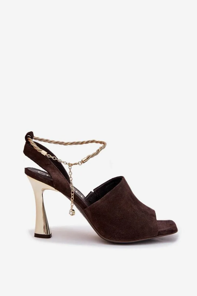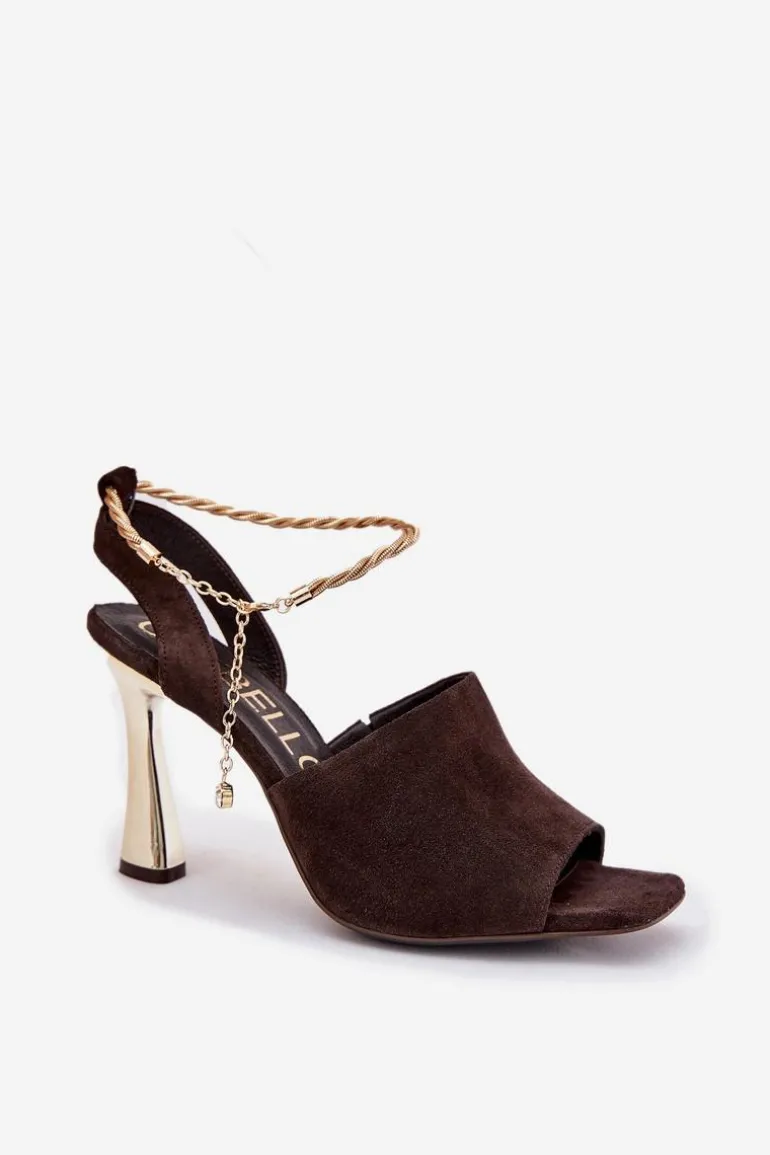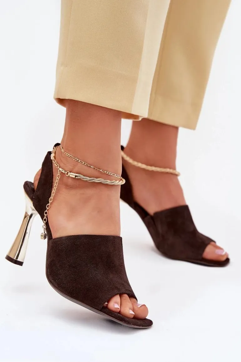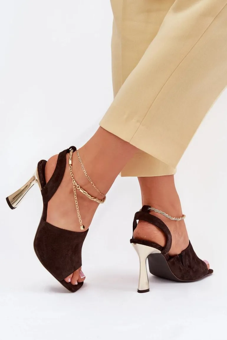 Sandały damskie od marki CheBello wykonane z wysokiej jakości naturalnego zamszu. Osadzone na smukłej szpilce, z subtelną bransoletą wokół kostki, dodającą elegancji i szyku. Idealne na wyjątkowe okazje oraz wieczorne wyjścia, łączą w sobie styl, klasę i komfort noszenia. Przy wyborze rozmiaru prosimy sugerować się tabelą rozmiarów.