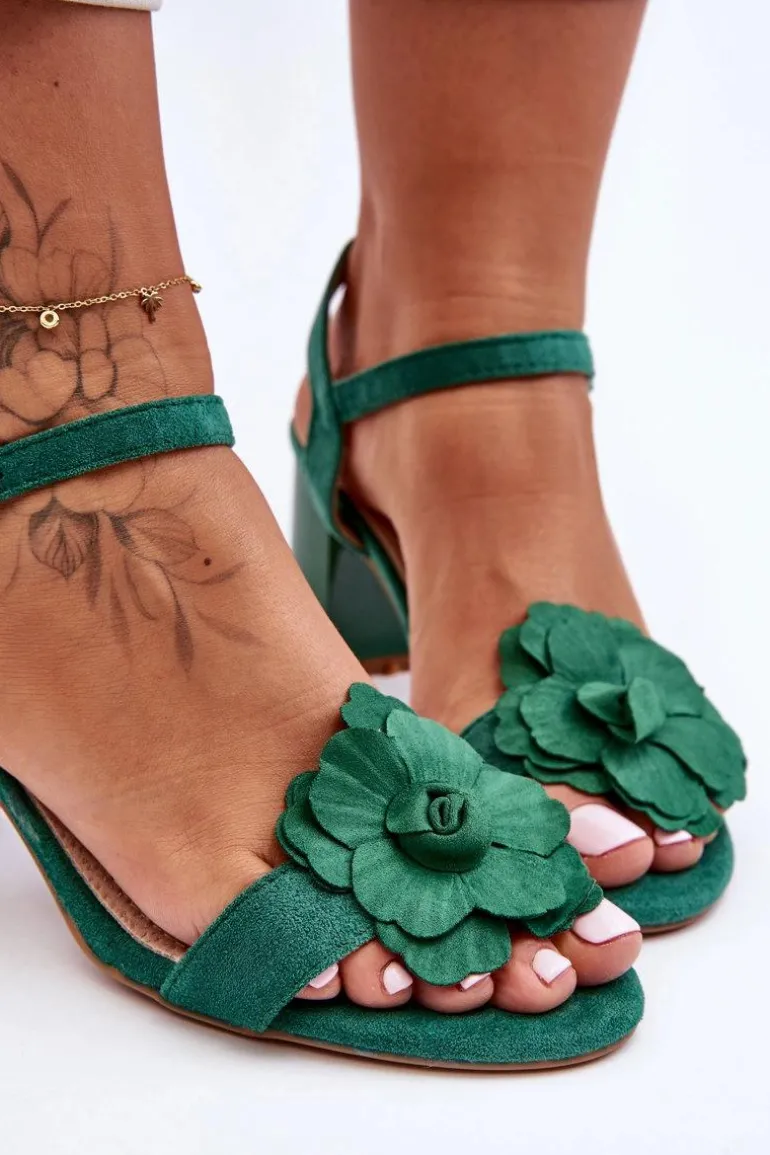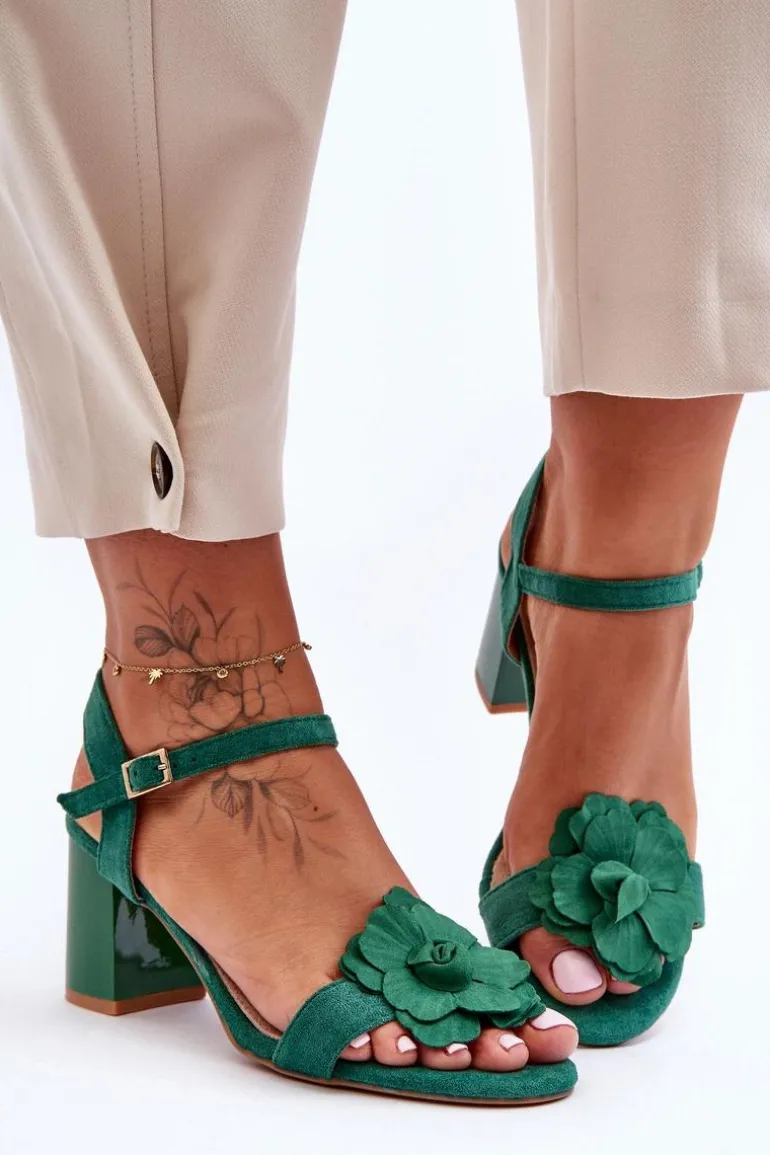 Cudowne, damskie sandałki zostały wykonane z eko zamszu. Model ten posiada na przednim pasku ozdobny kwiat. Sandałki są zapinane na regulowany pasek ze sprzączką. Miękka, a zarazem wygodna wykładka typu Comfort została wykonana z naturalnej skóry. Osadzono je na obcasie w postaci stabilnego słupka. Przy wyborze rozmiaru prosimy sugerować się tabelą rozmiarów.