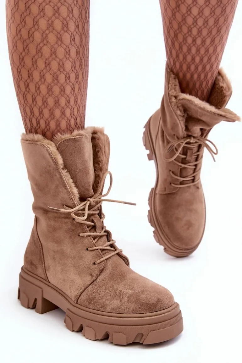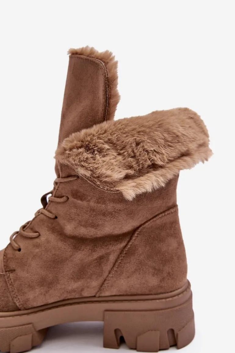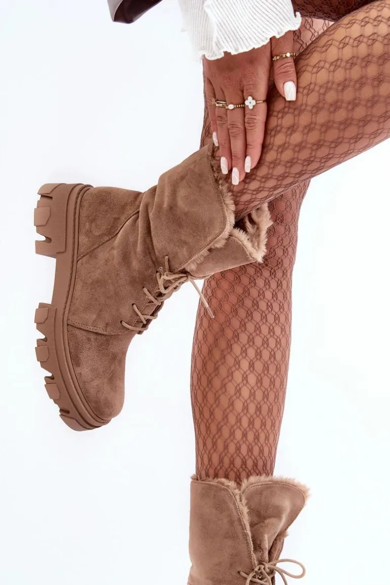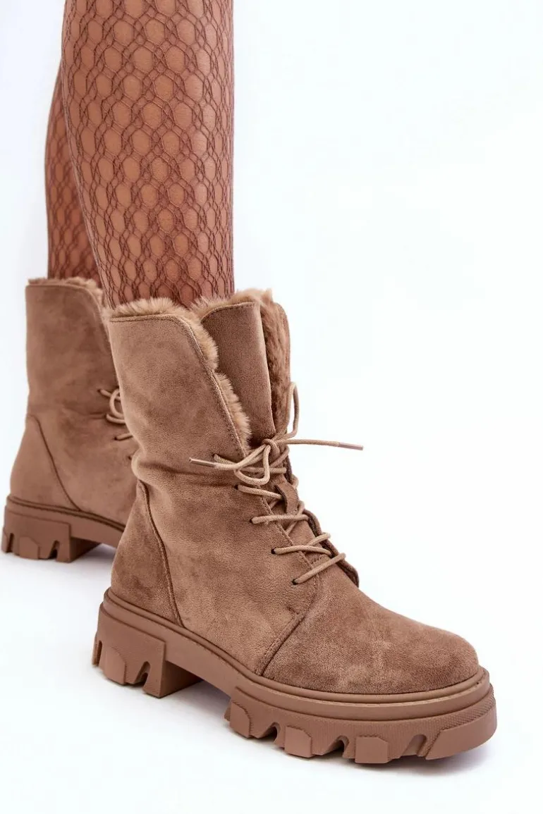 Zamszowe Sznurowane Botki Workery Z Futerkiem Ciemnobeżowe Frendo