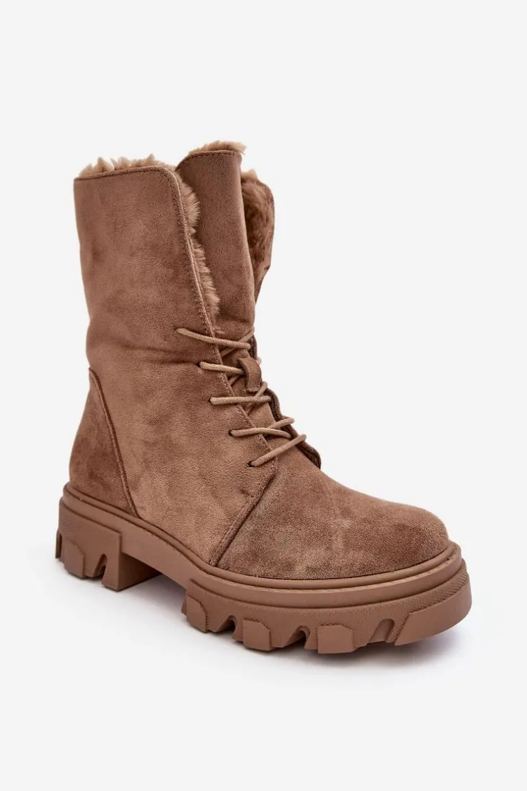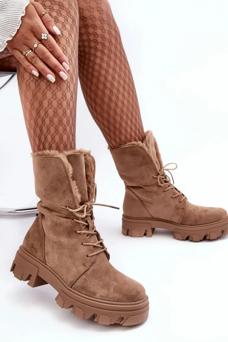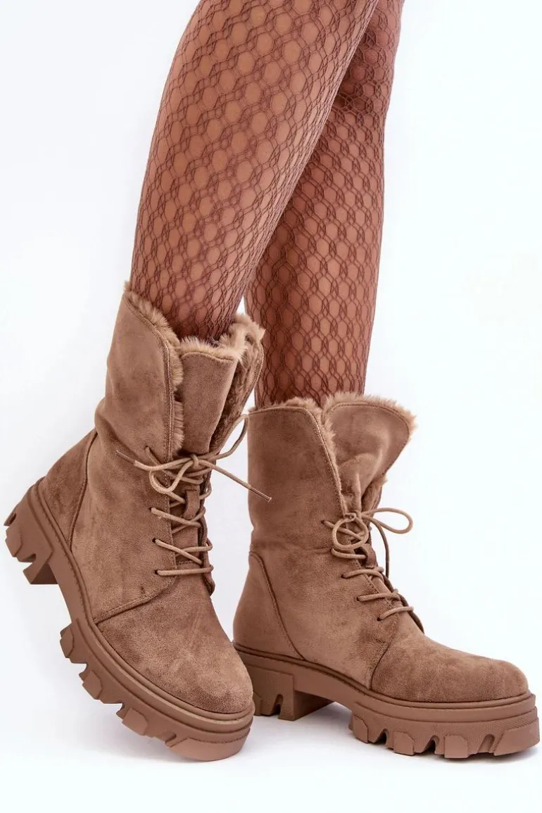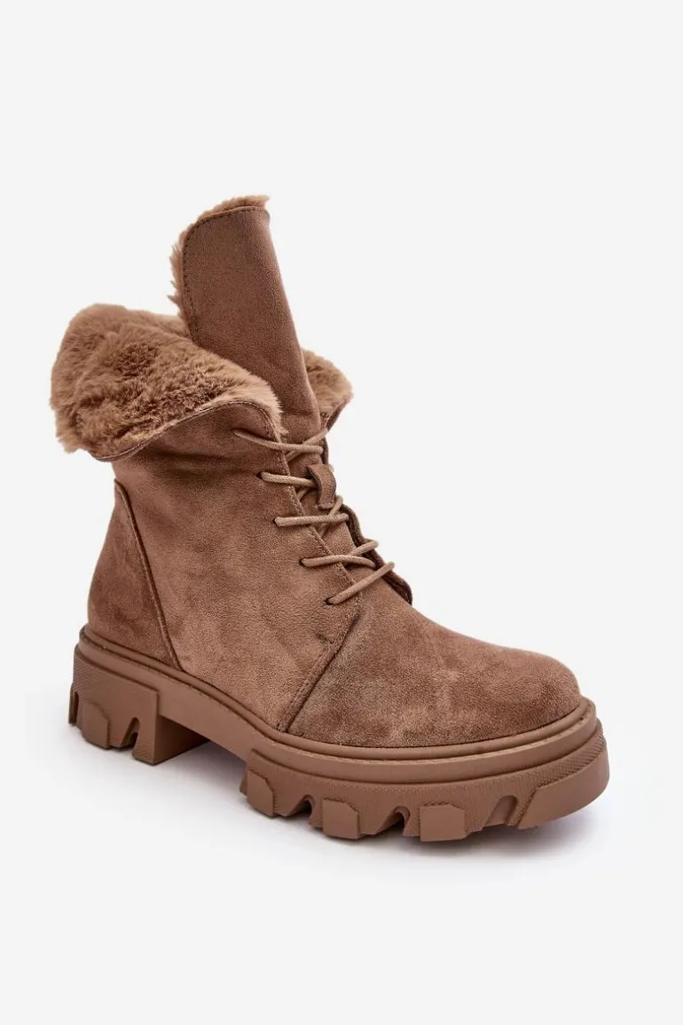 Zamszowe Sznurowane Botki Workery Z Futerkiem Ciemnobeżowe Frendo