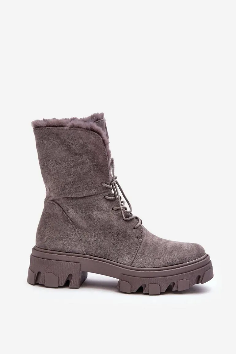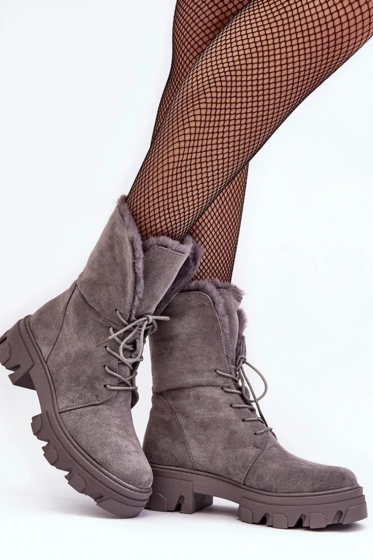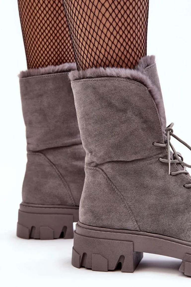 Zamszowe Sznurowane Botki Workery Z Futerkiem Szare Frendo