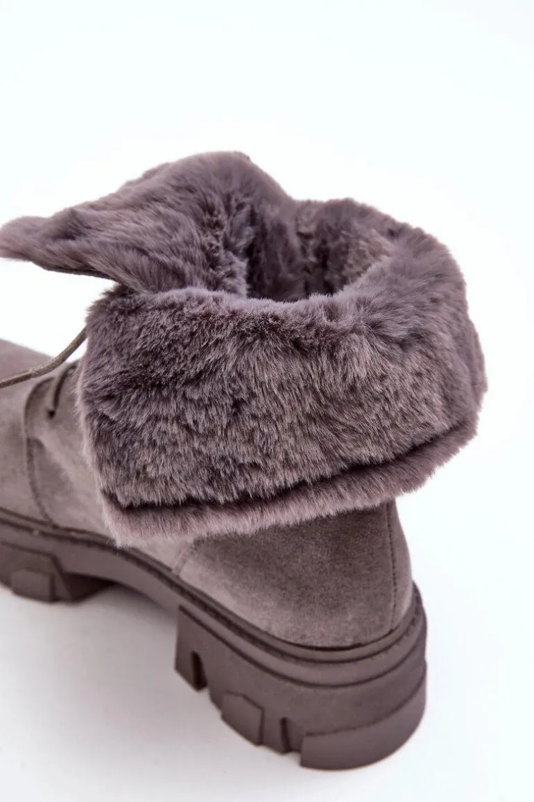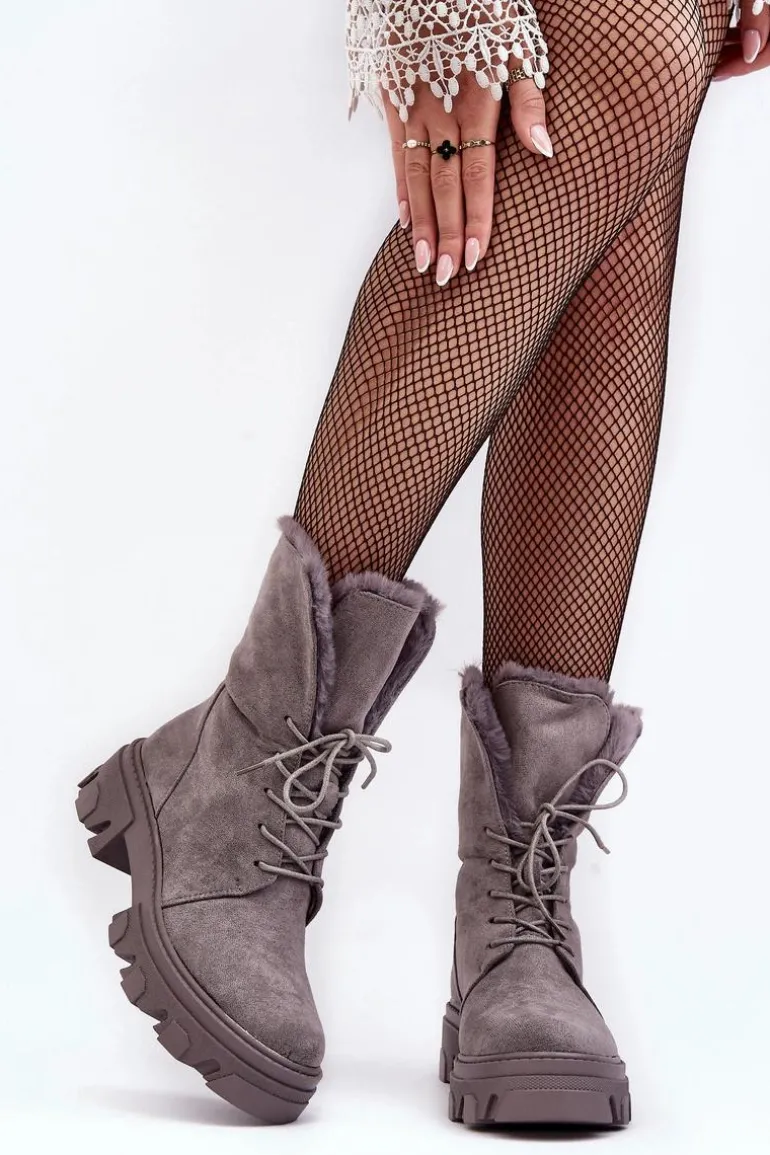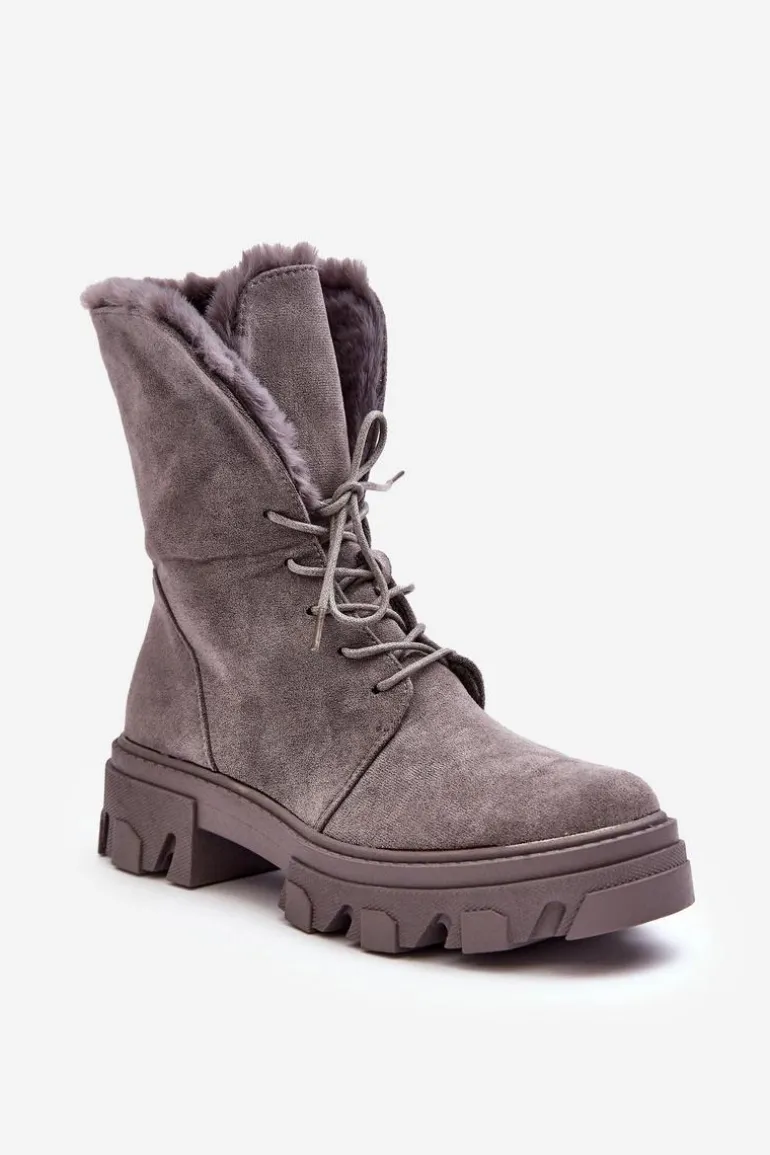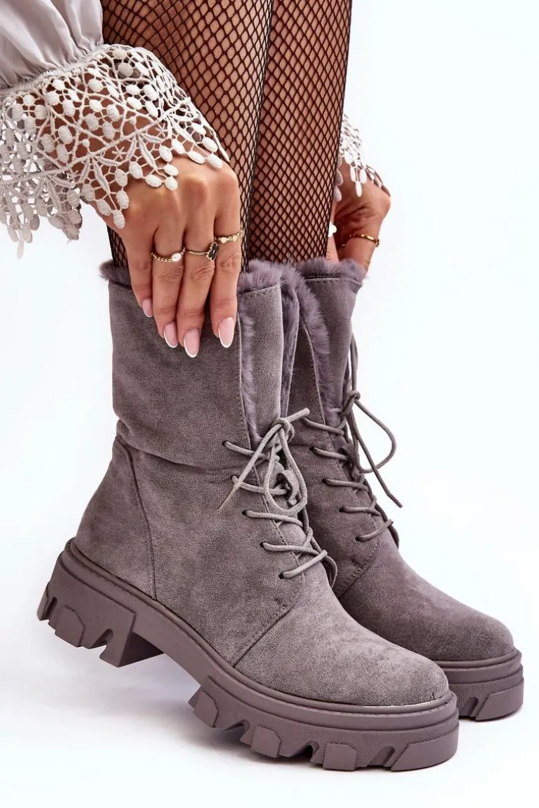 Zamszowe Sznurowane Botki Workery Z Futerkiem Szare Frendo