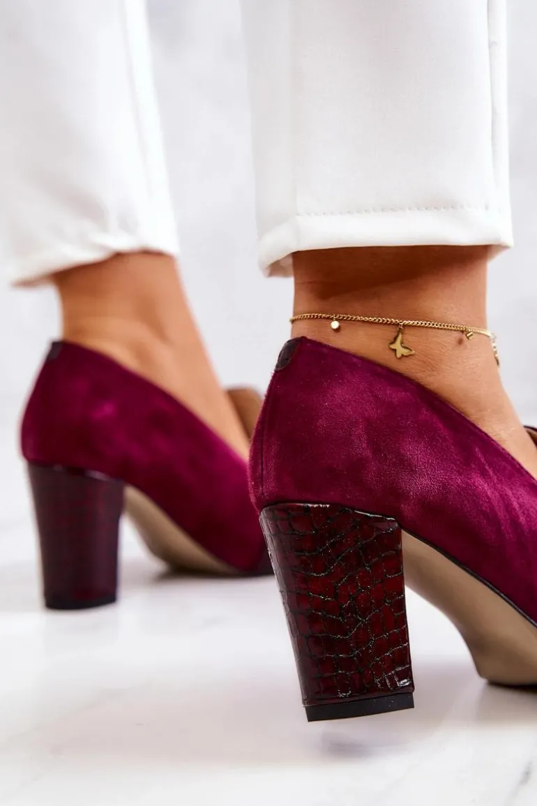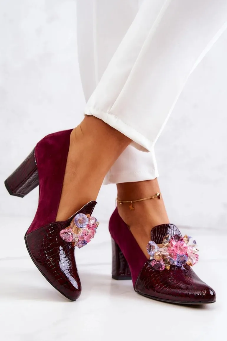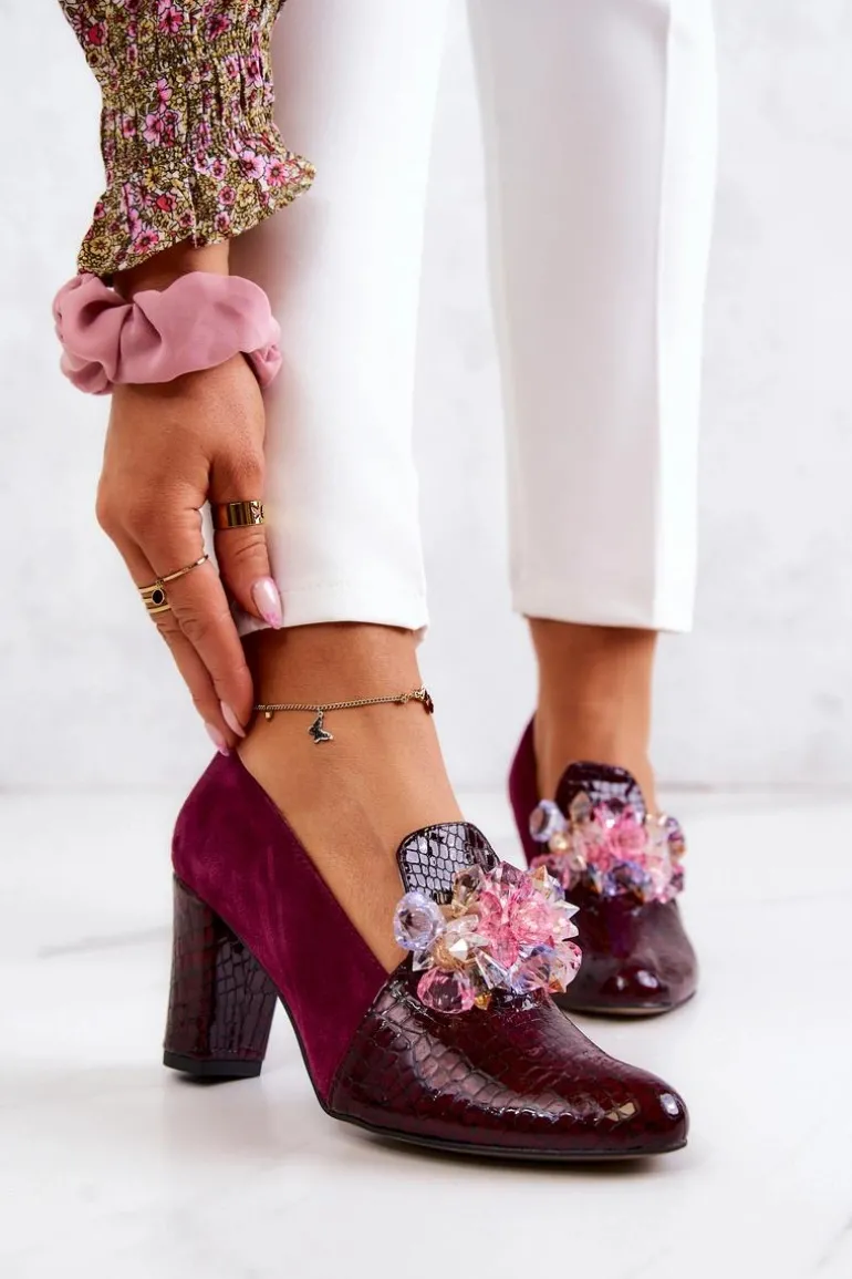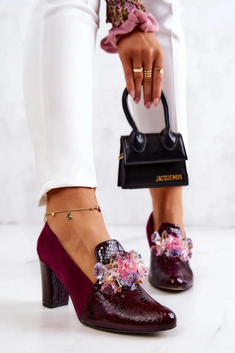 Zamszowe Wężowe Czółenka Z Ozdobą Bordowe Mallory