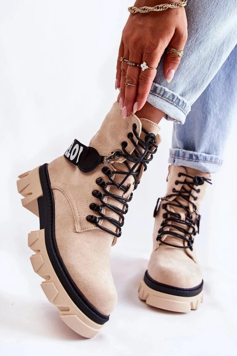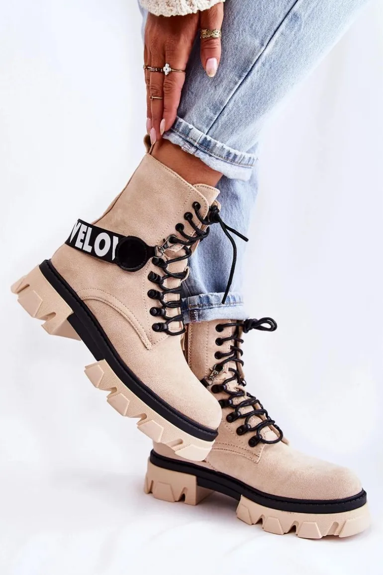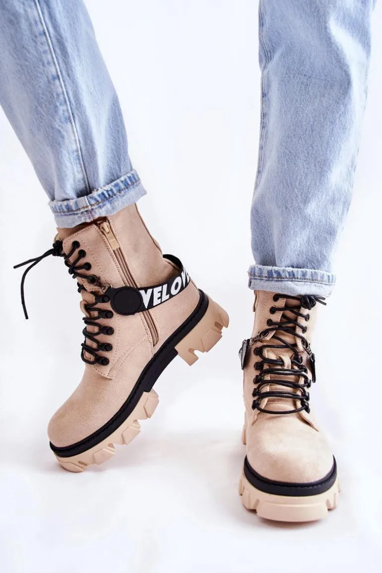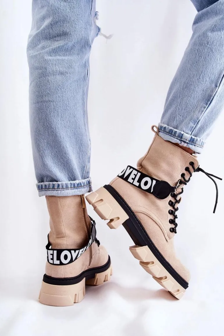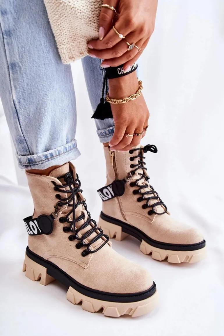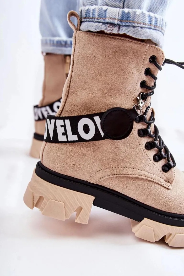 Ocieplane botki – workery świetnie sprawdzą podczas sezonu jesiennego. Zostały wykonane z eko zamszu. Posiadają delikatnie usztywniany zapiętek. Model z klasycznym wiązaniem oraz suwakiem z boku cholewki. Botki posiadają dodatkowo odpinany pasek z napisem. Osadzone na platformie z płaskim obcasem. Wysoka cholewka oraz wnętrze z kocem obuwniczym świetnie ochroni przed zimnem. Przy wyborze rozmiaru prosimy sugerować się tabelą rozmiarów.