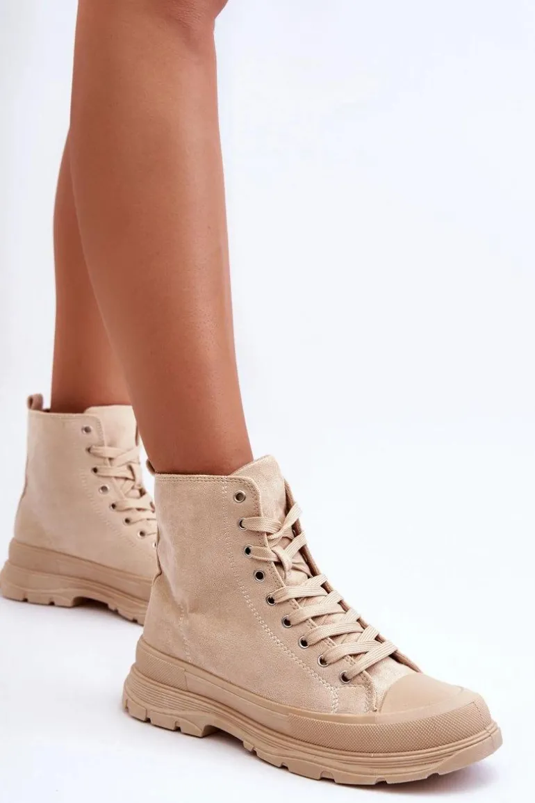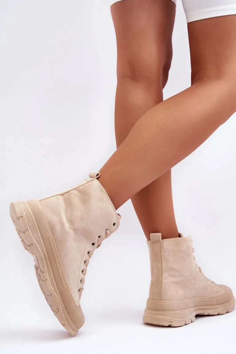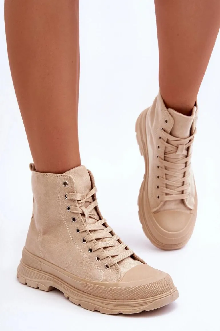 Modne, wysokie trampki damskie wykonane z eko zamszu. Model ten został osadzony na masywnej platformie. Buty posiadają klasyczne sznurowanie i zaokrąglony nosek. Modny fason sprawia, że możesz łączyć je w różnych stylizacjach. Koniecznie powinnaś je mieć! Przy wyborze rozmiaru prosimy sugerować się tabelą rozmiarów.