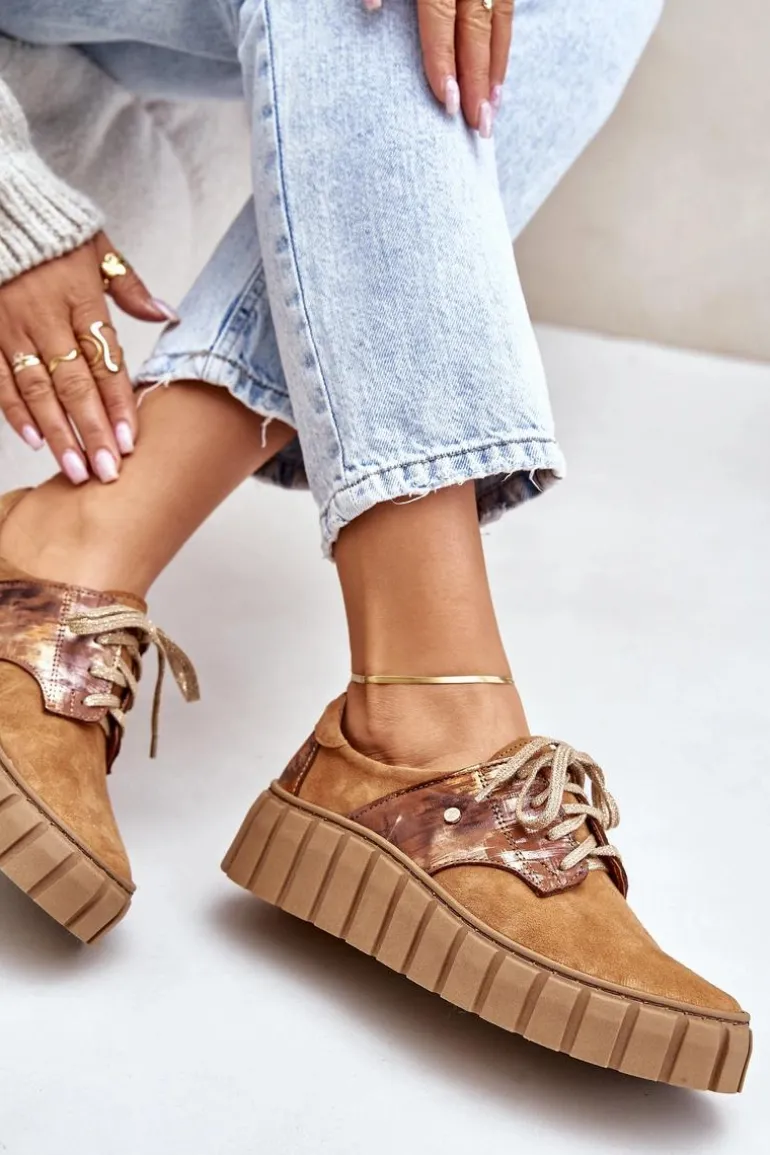 Półbuty posiadają wiązanie na płaskie, ozdobione błyszczącą nicią sznurowadła. Osadzone na masywnej platformie ze żłobieniami po bokach. Wewnątrz wygodna wkładka z naturalnej skóry, która jest dodatkowo profilowana. Cholewka przed kostkę została wykonana z naturalnego zamszu z efektem metalicznym. Bardzo lekkie i komfortowe w użytkowaniu. Idealne do eleganckich spodni, tiulowych spódnic czy dzianinowych sukienek. Możesz je łączyć z różnymi stylizacjami – zawsze będą wyglądać świetnie! Te cudne buty zdecydowanie muszą znaleźć się w Twojej garderobie! Przy wyborze rozmiaru prosimy sugerować się tabelą rozmiarów.