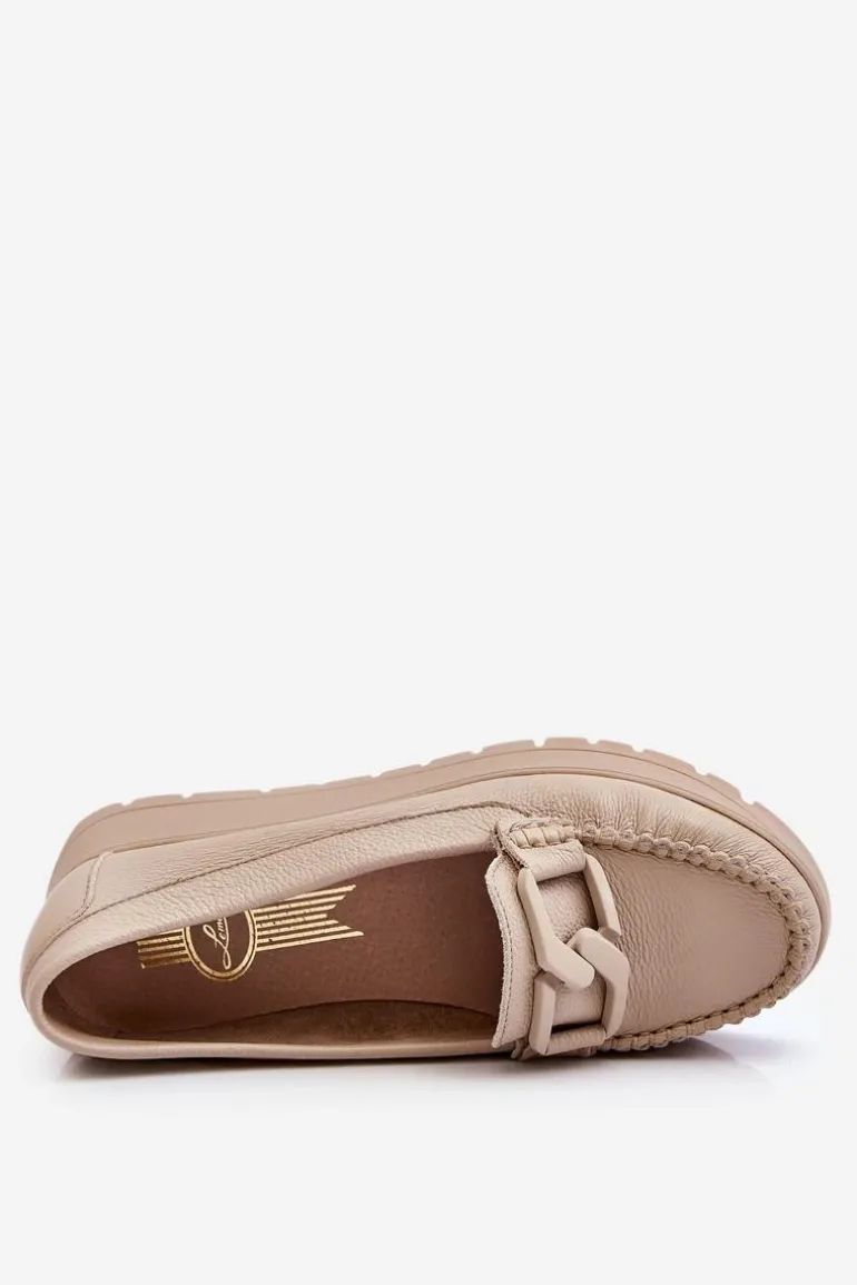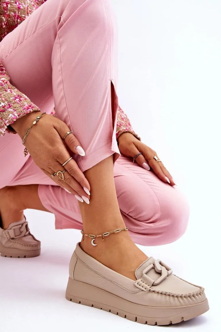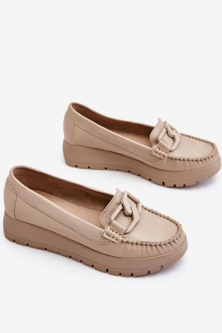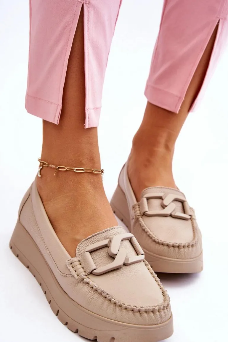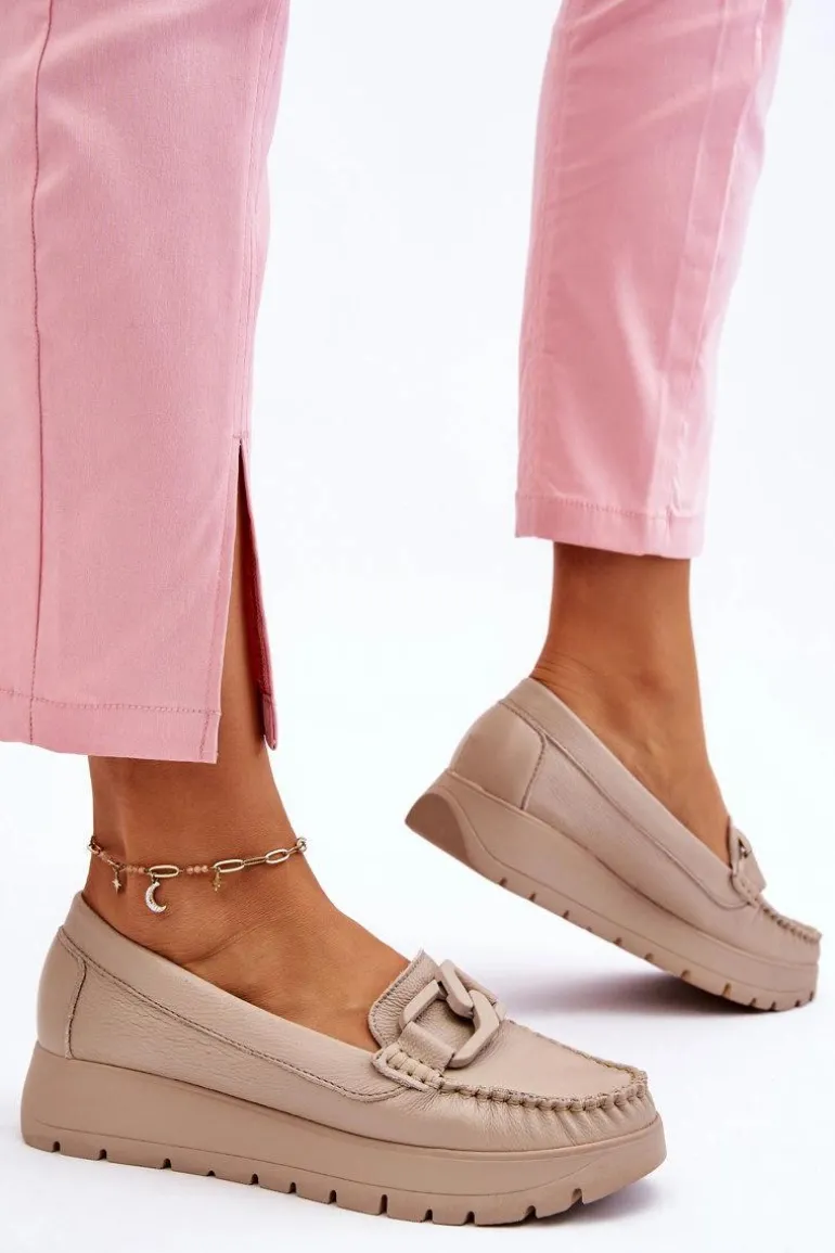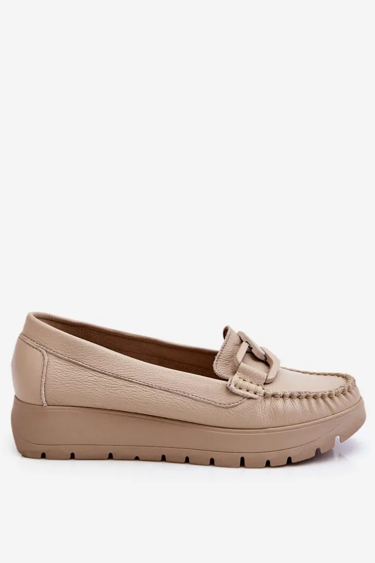 Damskie mokasyny zostały wykonane z naturalnej skóry z dbałością o szczegóły. Posiadają ozdobę na przodzie. Zapiętek w tych butach został usztywniony, co pozwoli na odpowiednią stabilizację stopy. Mokasyny są osadzone na delikatnym koturnie i platformie. Sprawdź także pozostałe modele dostępne na naszej stronie! Przy wyborze rozmiaru prosimy sugerować się tabelą rozmiarów.