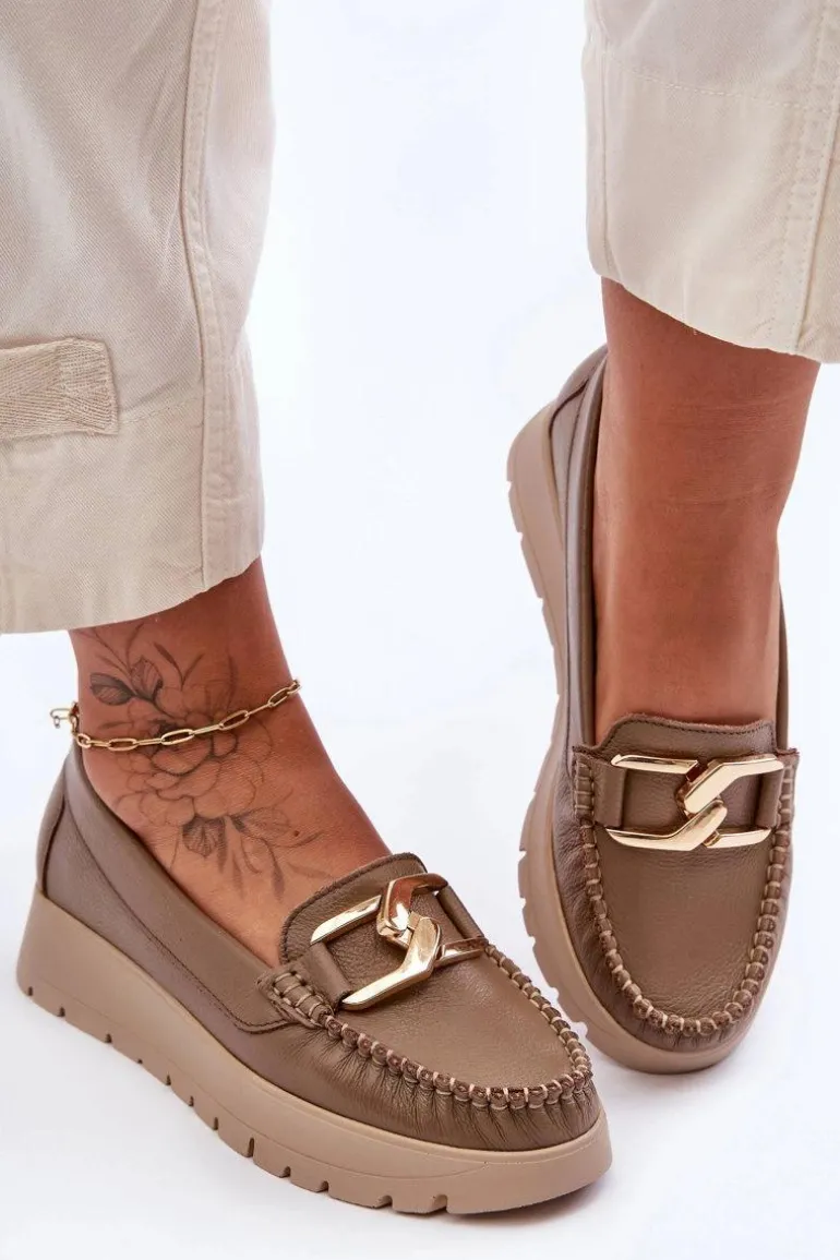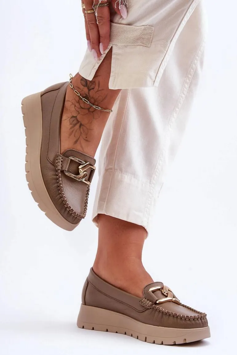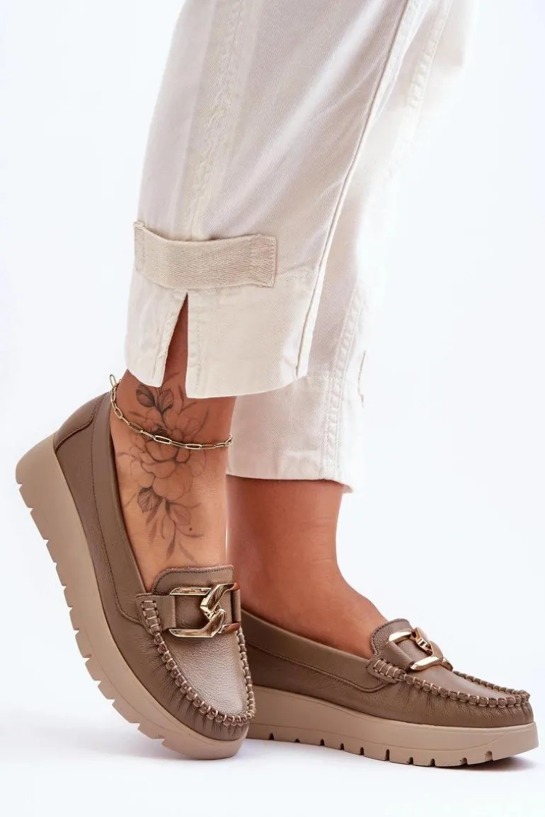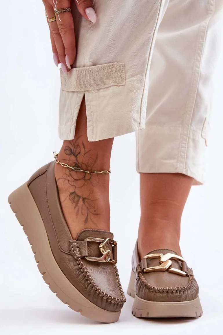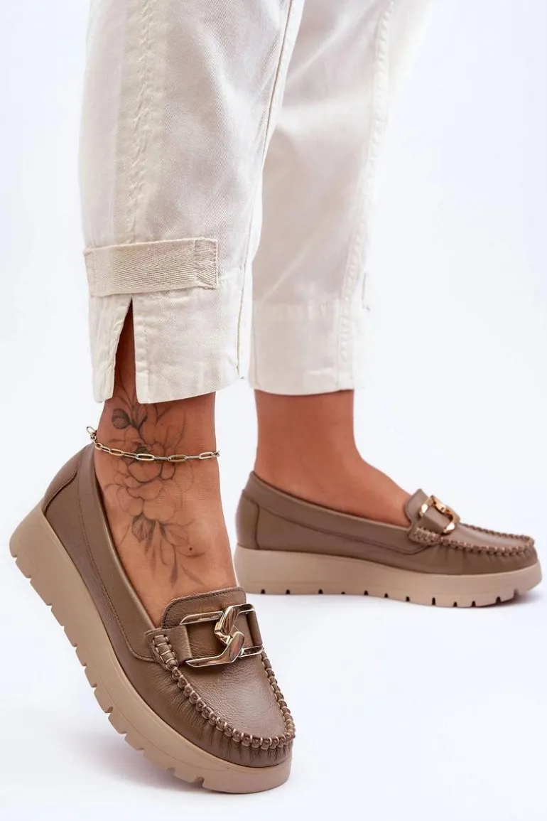 Damskie mokasyny zostały wykonane z naturalnej skóry z dbałością o szczegóły. Posiadają ozdobę na przodzie. Zapiętek w tych butach został usztywniony, co pozwoli na odpowiednią stabilizację stopy. Mokasyny są osadzone na delikatnym koturnie i platformie. Sprawdź także pozostałe modele dostępne na naszej stronie! Przy wyborze rozmiaru prosimy sugerować się tabelą rozmiarów.