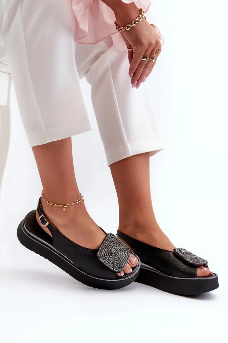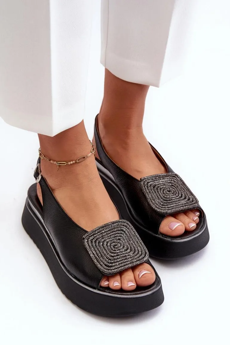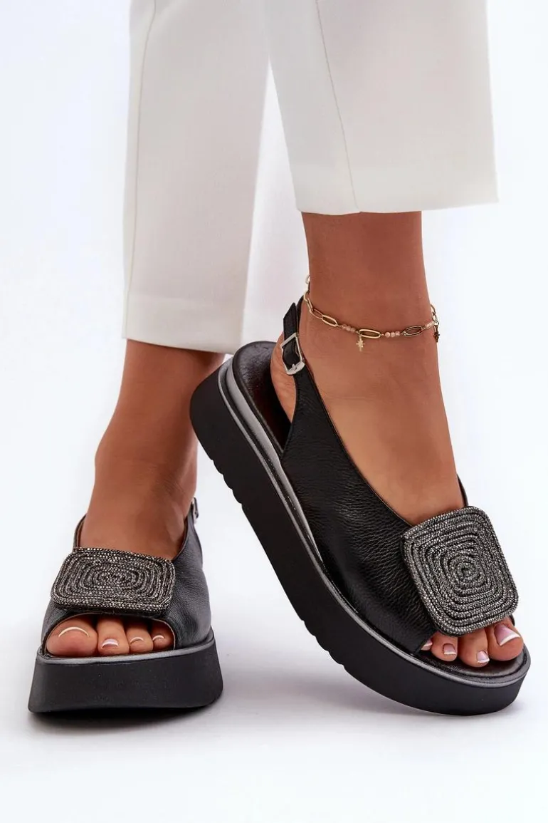Sandały damskie z naturalnej skóry to połączenie klasyki i wygody. Osadzone na platformie, zapewniają stabilność i komfort podczas noszenia. Ozdoba z przodu dodaje blasku, podkreślając ich wyjątkowy wygląd. Zapinane na regulowany pasek ze sprzączką gwarantują idealne dopasowanie do stopy. Te sandały są nie tylko stylowe, ale także praktyczne i funkcjonalne – idealne na różne okazje. Przy wyborze rozmiaru prosimy kierować się tabelą rozmiarów.