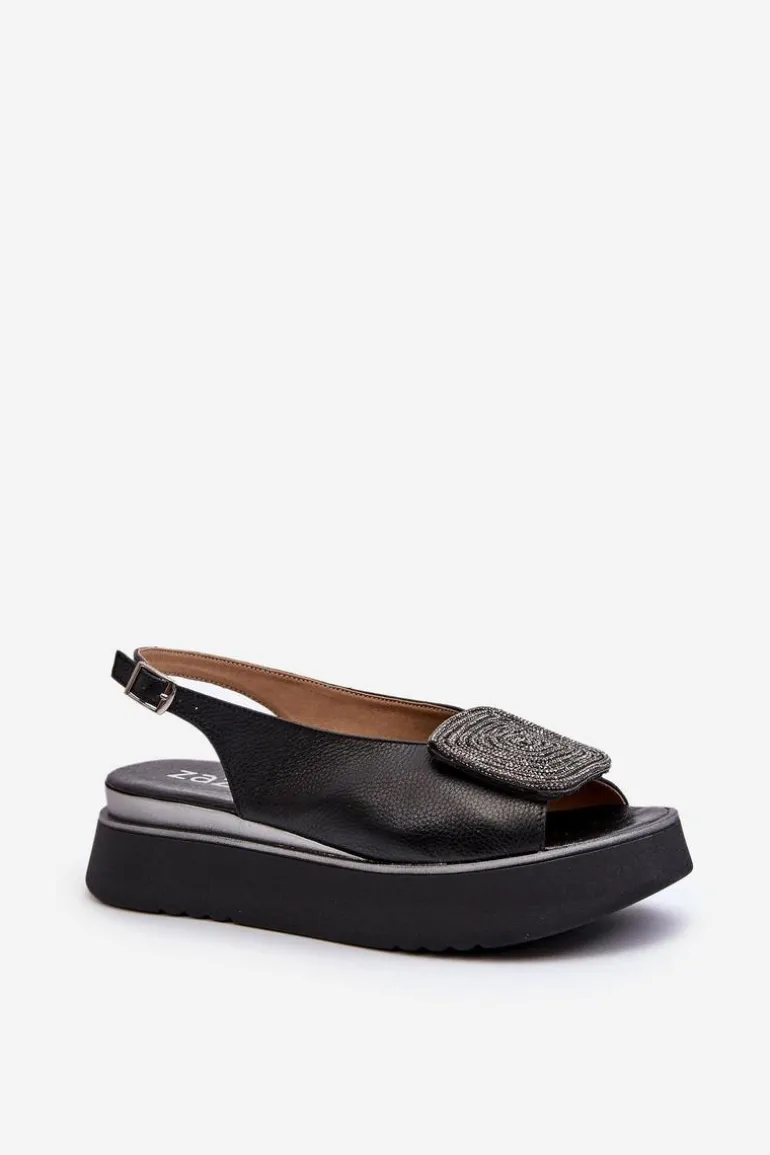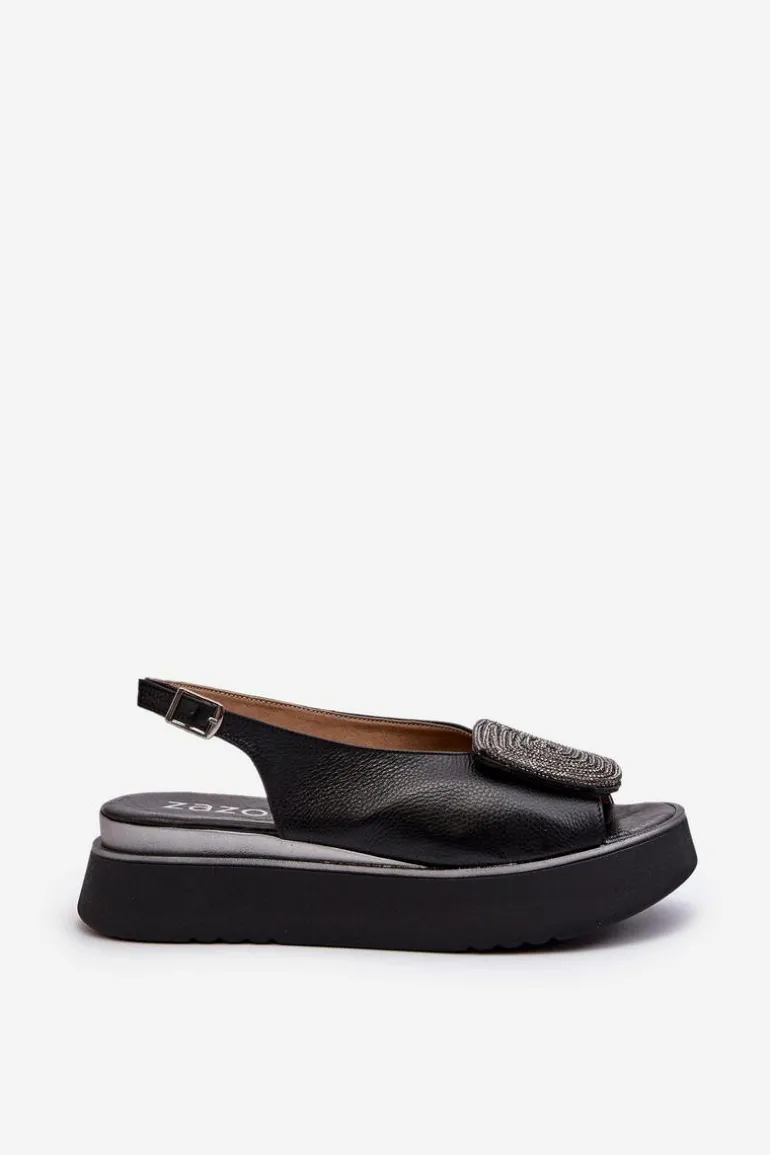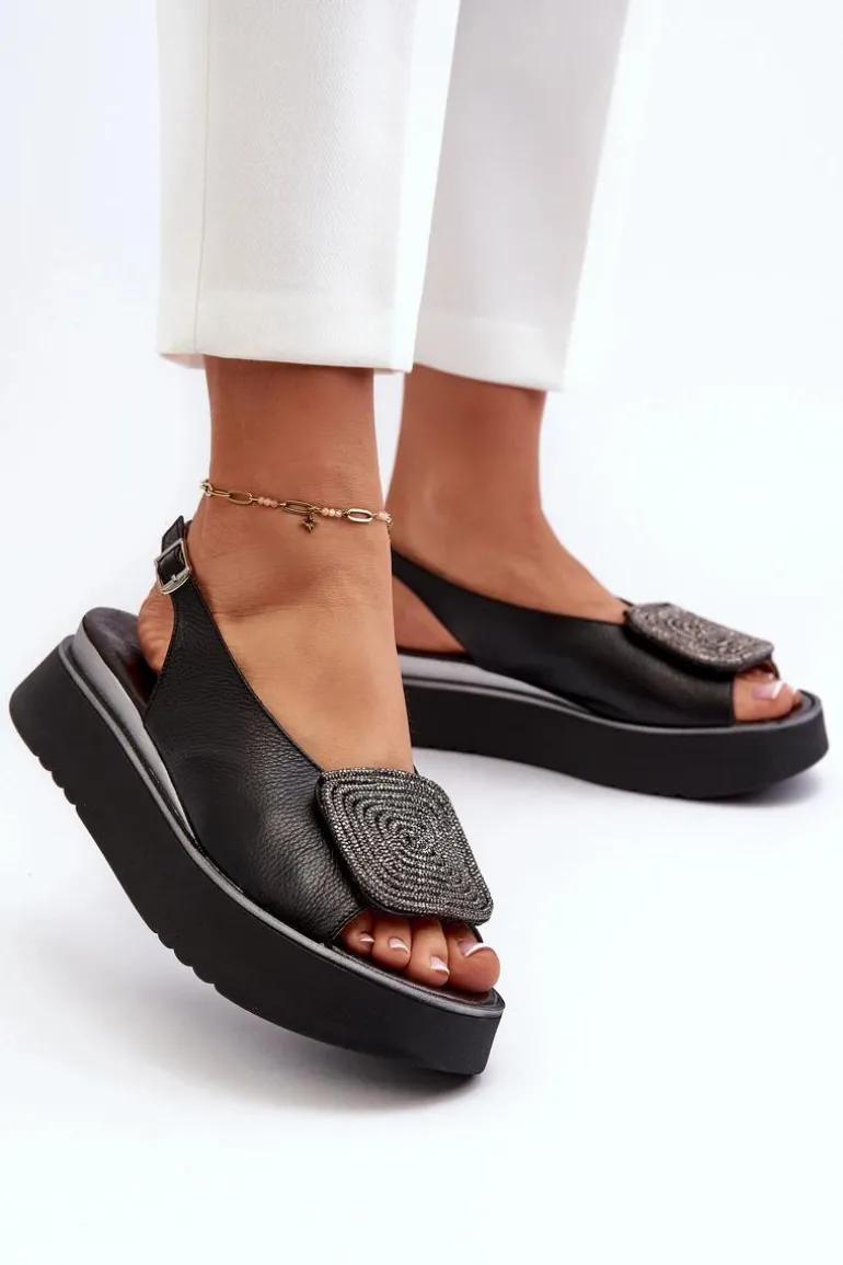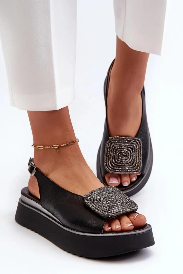 Sandały damskie z naturalnej skóry to połączenie klasyki i wygody. Osadzone na platformie, zapewniają stabilność i komfort podczas noszenia. Ozdoba z przodu dodaje blasku, podkreślając ich wyjątkowy wygląd. Zapinane na regulowany pasek ze sprzączką gwarantują idealne dopasowanie do stopy. Te sandały są nie tylko stylowe, ale także praktyczne i funkcjonalne – idealne na różne okazje. Przy wyborze rozmiaru prosimy kierować się tabelą rozmiarów.