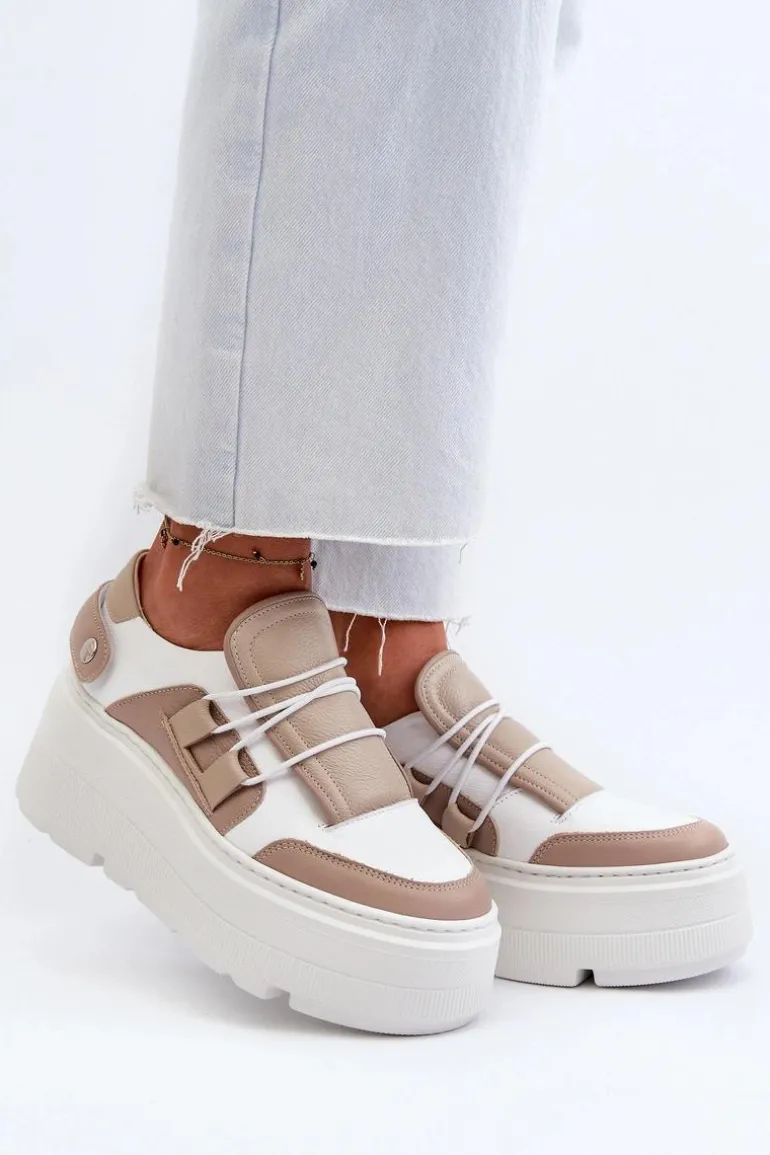 Wyjątkowe sneakersy damskie wykonane z wysokiej jakości skóry naturalnej. Ich masywna platforma dodaje im wyjątkowego stylu oraz sprawia, że prezentują się niezwykle modnie. Skórzana wkładka gwarantuje komfort podczas każdego użytkowania, a zaokrąglone noski dodają im dodatkowej elegancji. Doskonale sprawdzą się w codziennych stylizacjach, nadając im sportowego charakteru! Przy wyborze rozmiaru prosimy kierować tabelą rozmiarów.