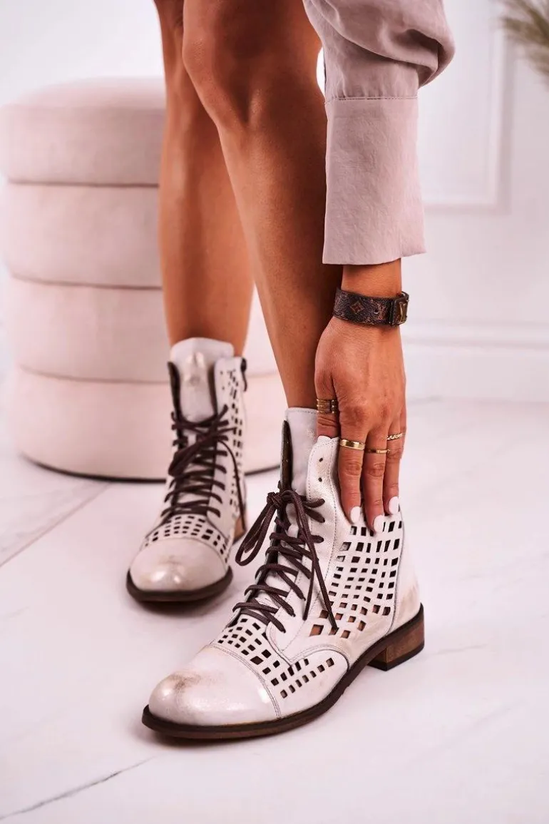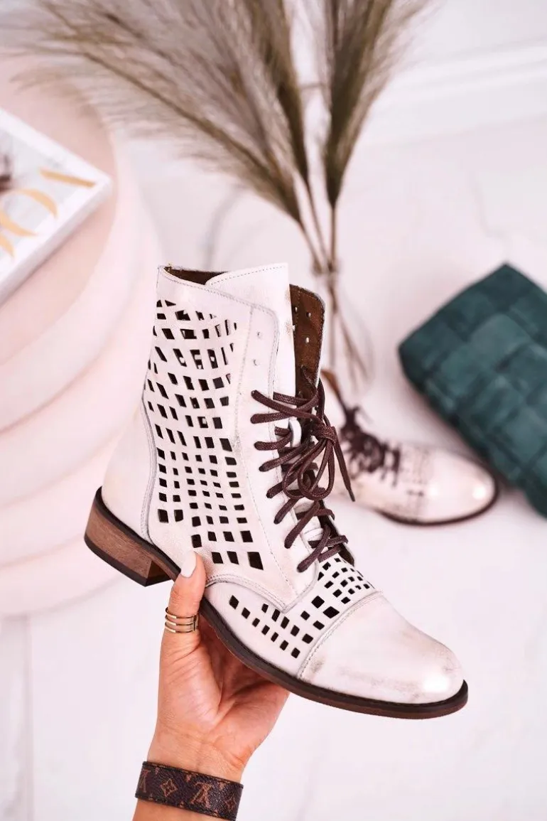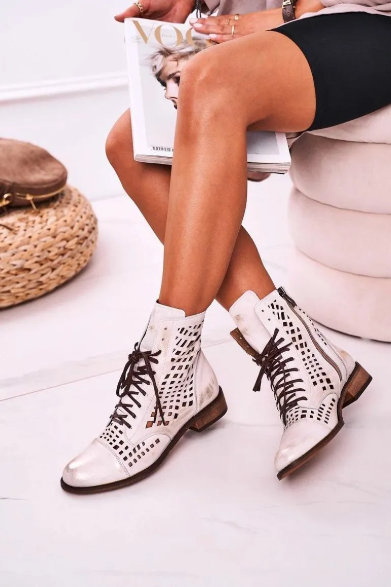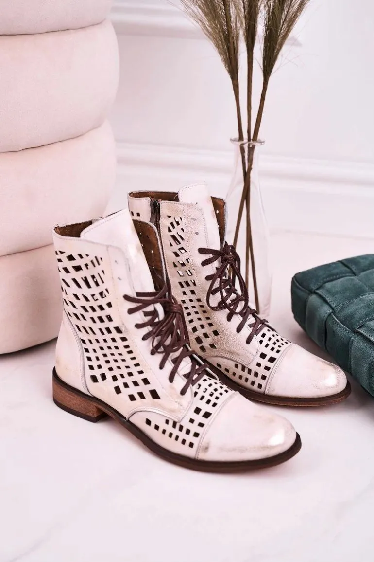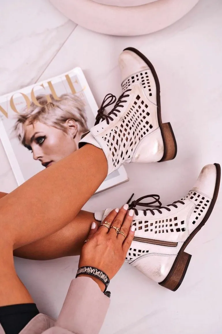 Wyjątkowe, ażurowe botki od polskiej firmy Nicole. Botki wykonane są w całości ze skóry naturalnej z dbałością o każdy detal. Skórzana wkładka oraz wygodny obcas zadbają o Twój komfort. Botki dopełnią wiele stylizacji. Koniecznie sprawdź całą naszą kolekcję butów marki Nicole. Przy wyborze rozmiaru prosimy sugerować się tabelą rozmiarów.