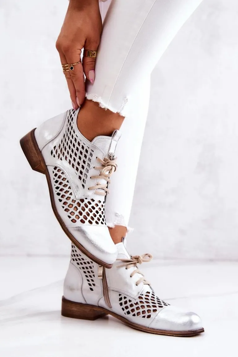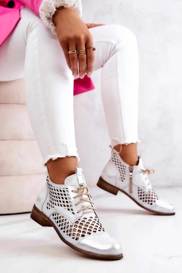 Zazoo 2704 Skórzane Ażurowe Botki Biało-Srebrne