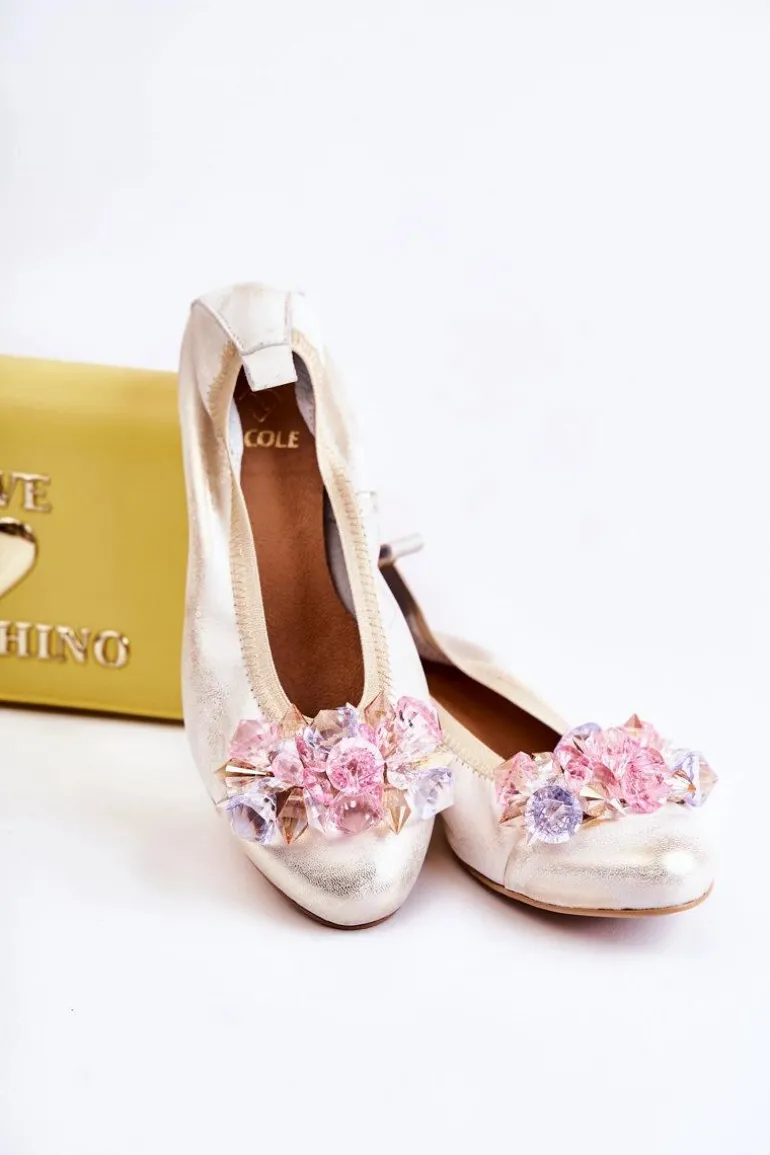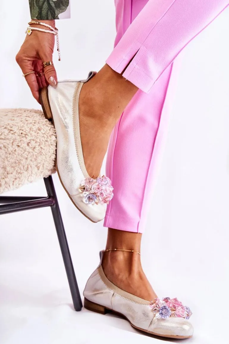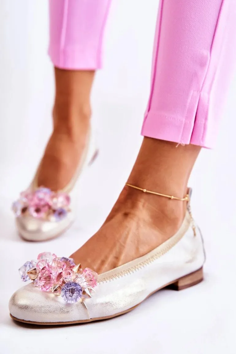 Damskie baleriny wykonane z wysokiej jakości naturalnej skóry. Posiadają delikatnie zaokrąglony nosek. Model wsuwany ze ściągaczem. Osadzone na niewysokim, płaskim obcasie. Na przodzie znajduje się ozdoba w kształcie kryształków. Wkładka wykonana z naturalnej skóry jest miękka i wygodna w użytkowaniu. Komfort gwarantowany! Koniecznie powinnaś mieć ten model w swojej garderobie! Przy wyborze rozmiaru prosimy sugerować się tabelą rozmiarów.