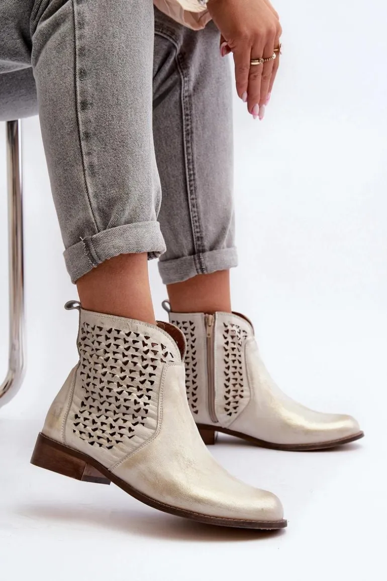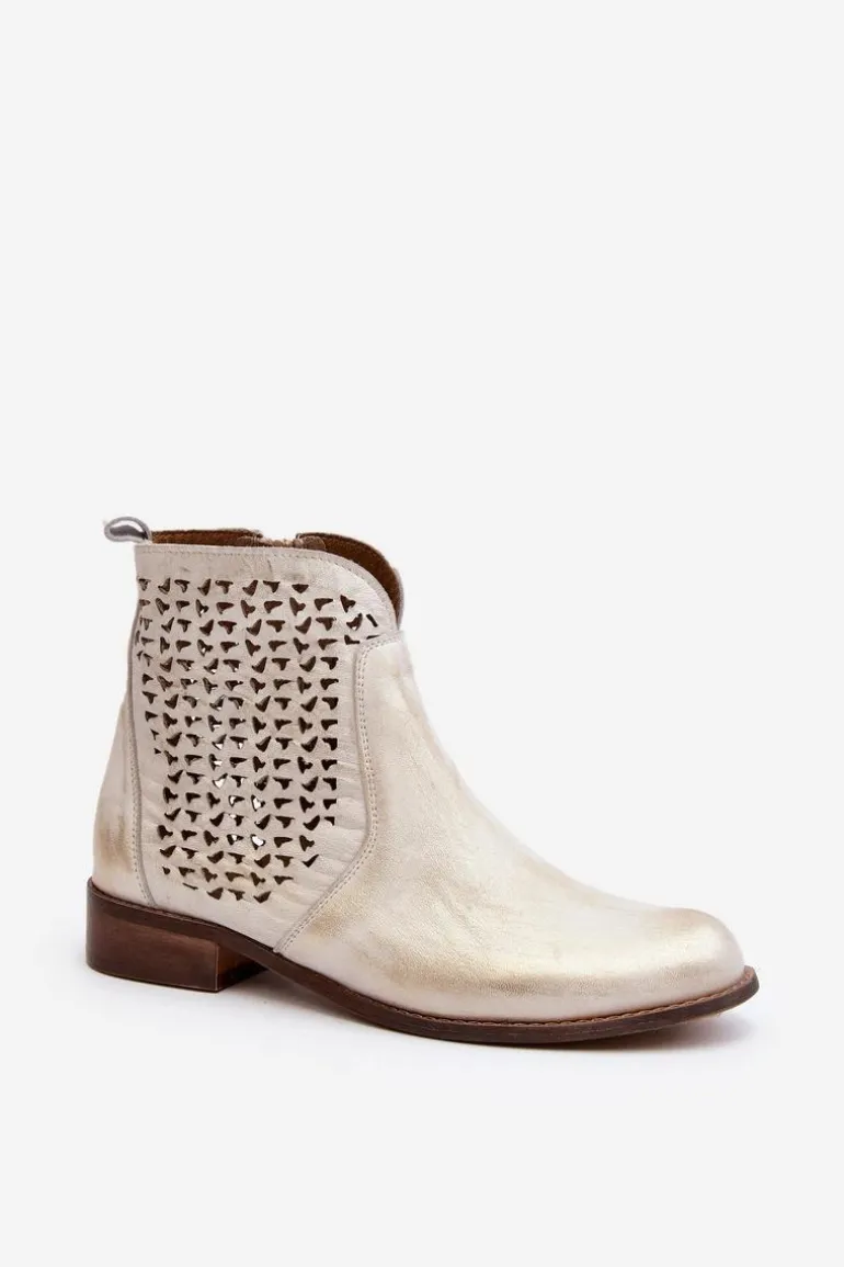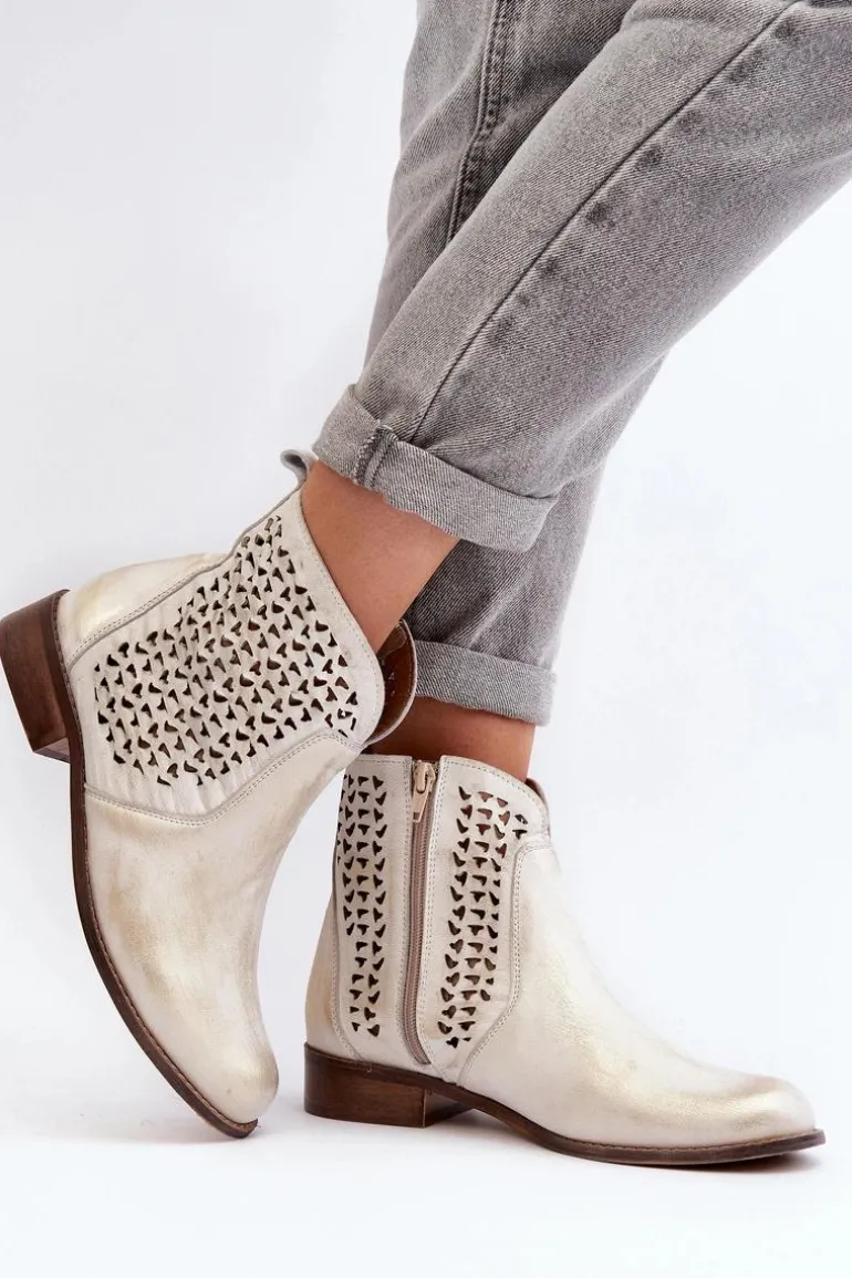 Botki zostały wykonane ze skóry naturalnej. Zakładanie ułatwi wszyty na boku suwak. Botki posiadają ażurowy wzorek. Posiadają płaski obcas oraz wygodną, wykonaną z naturalnej skóry wkładkę. Ten niezwykle komfortowy model powinien znaleźć się w Twojej szafie! Przy wyborze rozmiaru prosimy sugerować się tabelą rozmiarów.