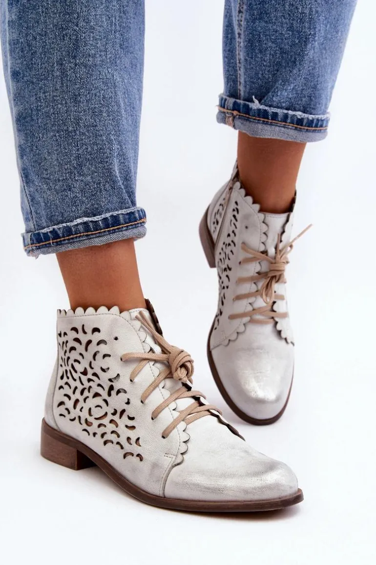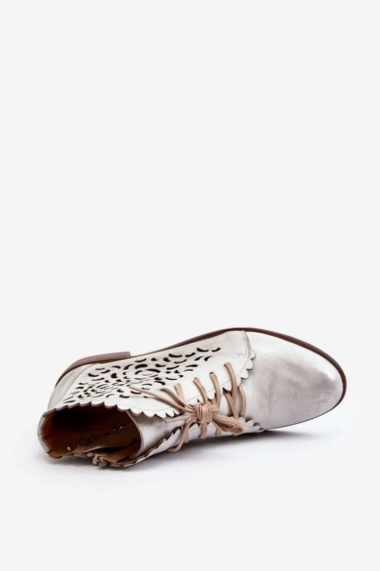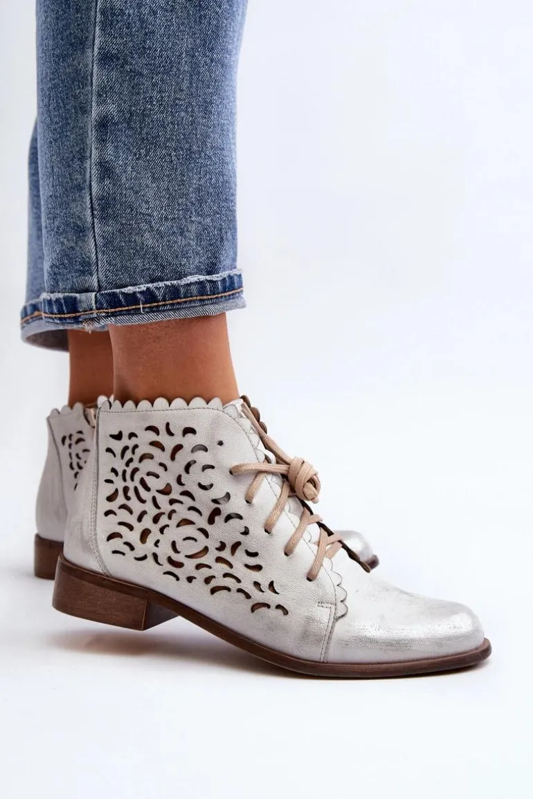 Botki damskie zostały wykonane z wysokiej jakości skóry naturalnej. Osadzone na płaskim obcasie. Cholewka za kostkę. Noski zaokrąglone. Wkładka z naturalnej skóry zapewni komfort podczas użytkowania. Model zapinany na suwak oraz dodatkowo posiada sznurowanie. Idealne do spodni, spódnic i sukienek. Koniecznie powinnaś je mieć! Przy wyborze rozmiaru prosimy sugerować się tabelą rozmiarów.