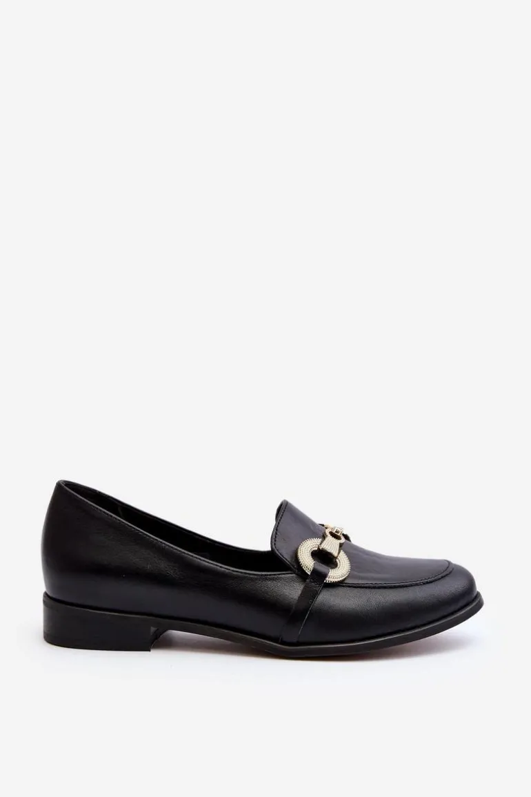 Eleganckie mokasyny damskie wykonane ze skóry naturalnej. Ten fason idealnie sprawdzi się w sezonie wiosenno-jesiennym. Noski zaokrąglone. Z przodu złota ozdoba. Usztywniony zapiętek. Wkładka ze skóry naturalnej zapewni komfort podczas noszenia. Ten model idealnie sprawdzi się zarówno w casualowych, jak i bardziej eleganckich outfitach! Przy wyborze rozmiaru prosimy sugerować się tabelą rozmiarów.