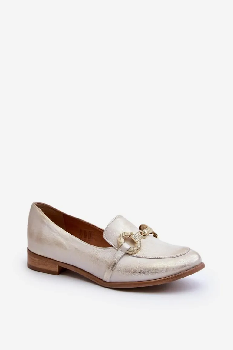 Eleganckie mokasyny damskie wykonane ze skóry naturalnej. Ten fason idealnie sprawdzi się w sezonie wiosenno-jesiennym. Noski zaokrąglone. Z przodu złota ozdoba. Usztywniony zapiętek. Wkładka ze skóry naturalnej zapewni komfort podczas noszenia. Ten model idealnie sprawdzi się zarówno w casualowych, jak i bardziej eleganckich outfitach! Przy wyborze rozmiaru prosimy sugerować się tabelą rozmiarów.