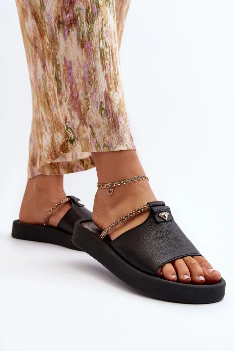 Wygodne klapki damskie wykonane ze skóry naturalnej. Osadzone na grubej podeszwie z gumowego tworzywa. Model ten posiada ozdobny paseczek z mieniącymi się dżetami. Miękka wkładka zapewni komfort nawet w upalne dni! Koniecznie sprawdź całą naszą kolekcję damskich klapek! Przy wyborze rozmiaru prosimy sugerować się tabelą rozmiarów.