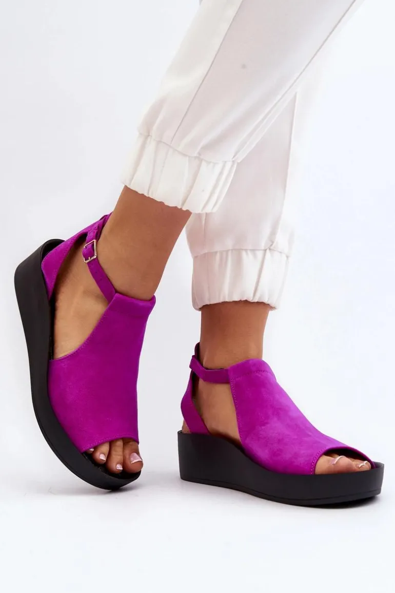 Wygodne sandały damskie to idealny wybór na letnie dni! Wykonane z naturalnego zamszu. Osadzone na platformie oraz delikatnym koturnie. Zapinane na regulowany pasek ze sprzączką. Miękka wkładka ze skóry naturalnej zapewni komfort podczas użytkowania obuwia. Idealne do każdej letniej stylizacji! Przy wyborze rozmiaru prosimy kierować się tabelą rozmiarów.