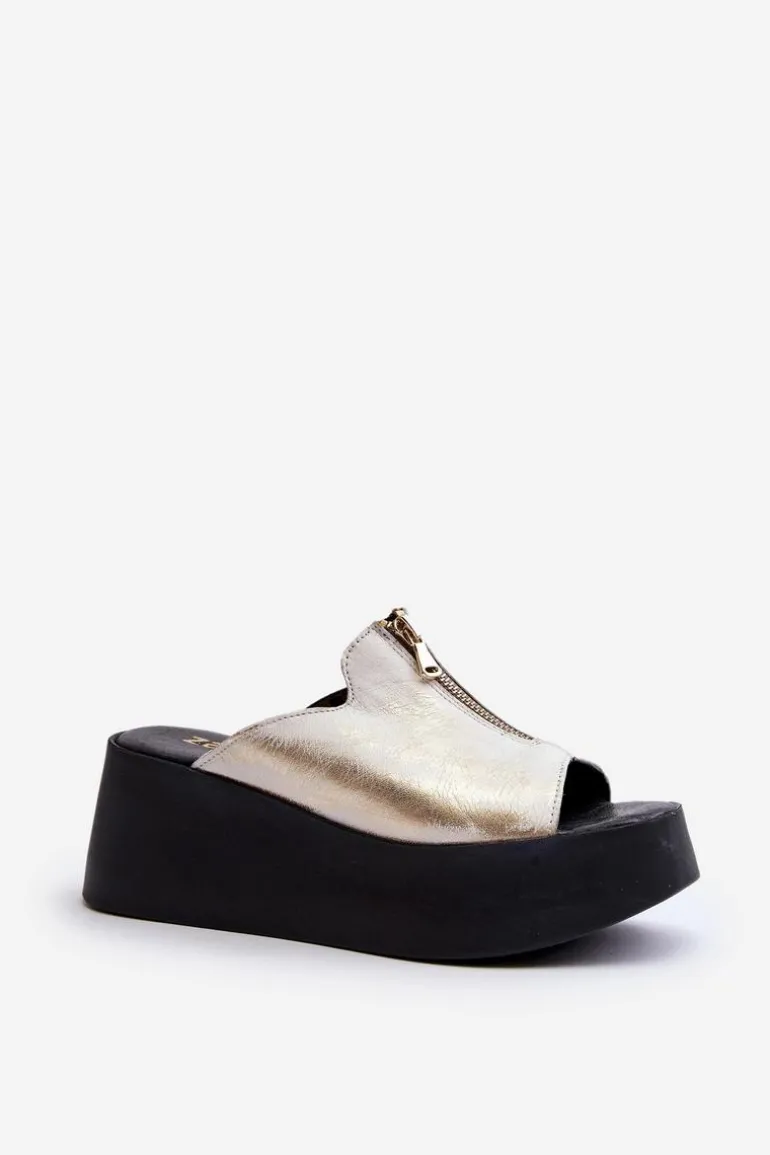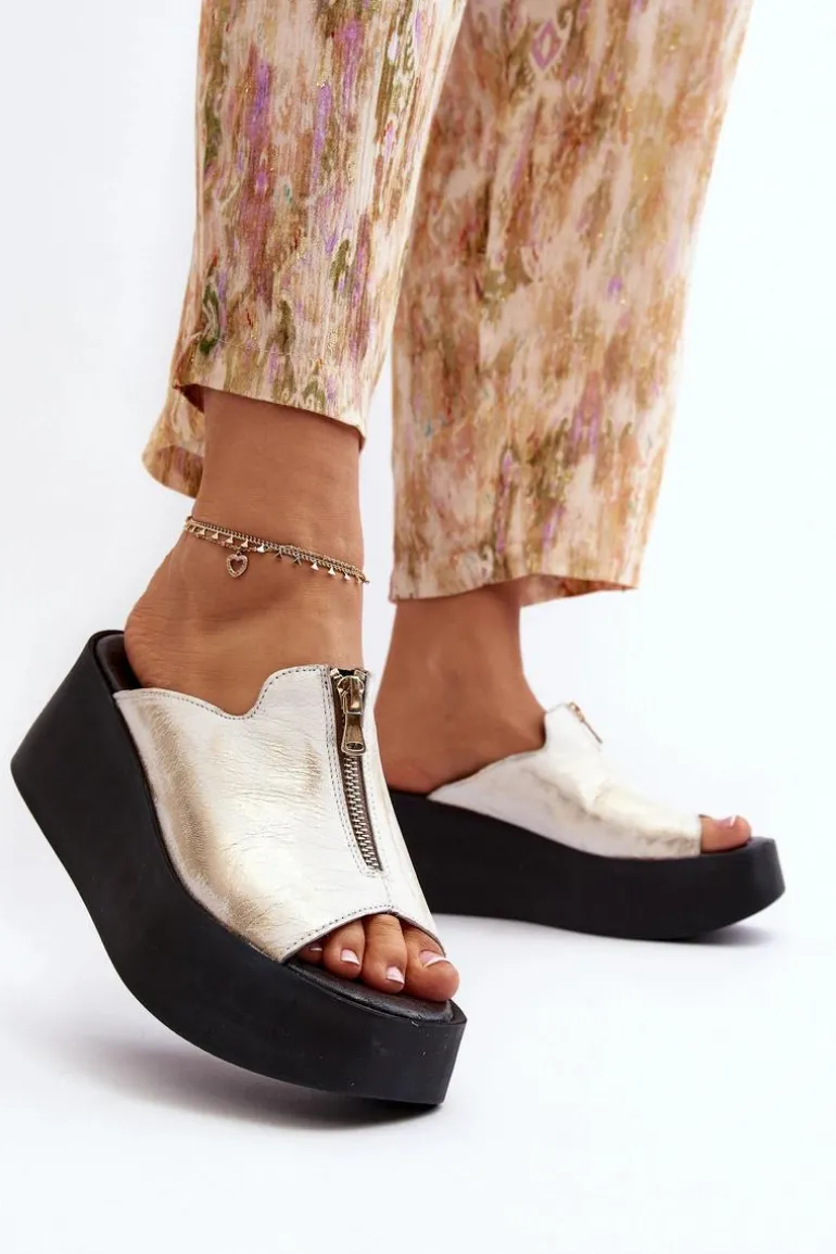Stylowe klapki damskie osadzone na masywnej platformie. Wykonane ze skóry naturalnej. Z przodu cholewki ozdobny zamek. Miękka, skórzana wkładka zapewni komfort nawet w upalne dni! Koniecznie sprawdź całą naszą kolekcję damskich klapek! Przy wyborze rozmiaru prosimy sugerować się tabelą rozmiarów.