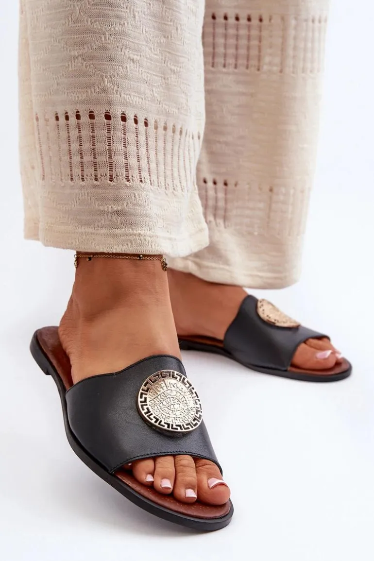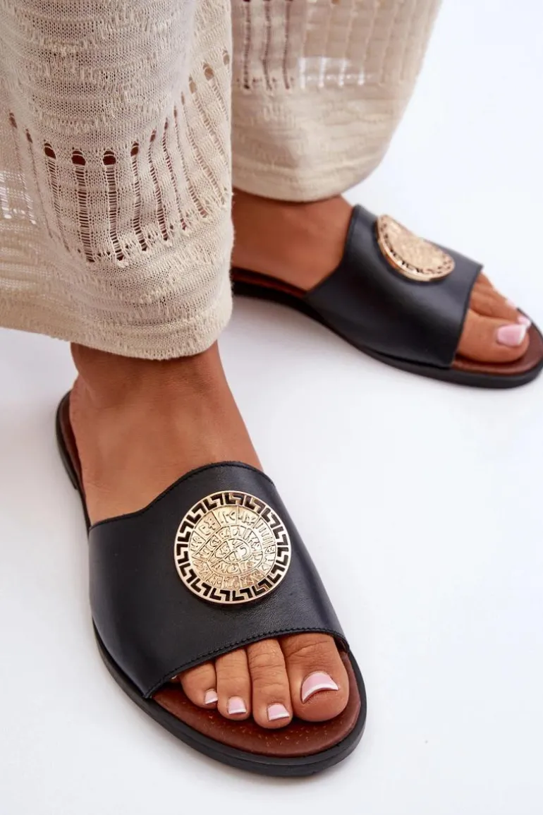 Damskie klapki wykonane ze skóry naturalnej to doskonały wybór dla kobiet, które cenią sobie elegancję i wygodę. Osadzone na płaskim obcasie, zapewniają komfort noszenia przez cały dzień, co sprawia, że są idealne zarówno do codziennych stylizacji, jak i na bardziej formalne okazje. Wzbogacone złotą ozdobą, która dodaje im wyjątkowego uroku i klasy. Dzięki starannemu wykonaniu te klapki są trwałe i stylowe, stanowiąc niezbędny element w każdej kobiecej garderobie. Przy wyborze rozmiaru prosimy sugerować się tabelą rozmiarów.