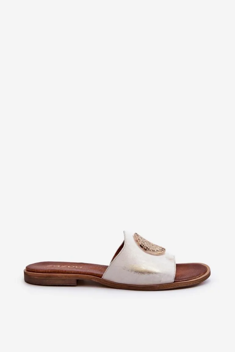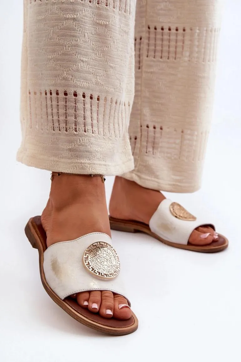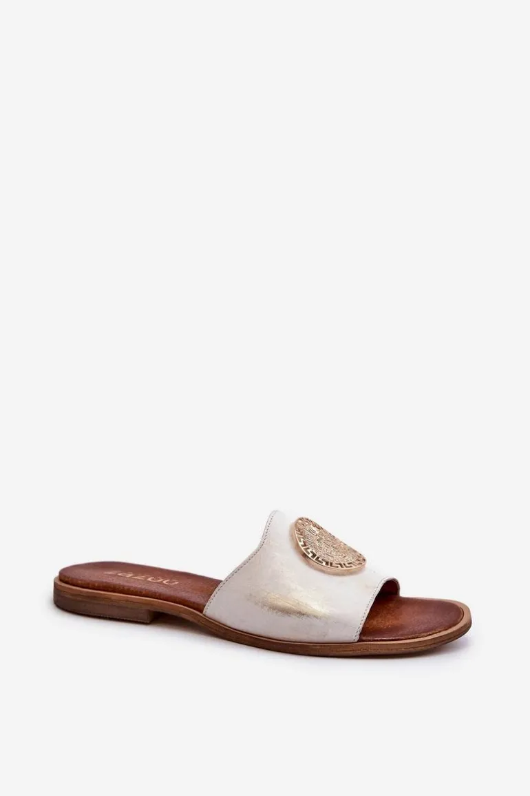 Damskie klapki wykonane ze skóry naturalnej to doskonały wybór dla kobiet, które cenią sobie elegancję i wygodę. Osadzone na płaskim obcasie, zapewniają komfort noszenia przez cały dzień, co sprawia, że są idealne zarówno do codziennych stylizacji, jak i na bardziej formalne okazje. Wzbogacone złotą ozdobą, która dodaje im wyjątkowego uroku i klasy. Dzięki starannemu wykonaniu te klapki są trwałe i stylowe, stanowiąc niezbędny element w każdej kobiecej garderobie. Przy wyborze rozmiaru prosimy sugerować się tabelą rozmiarów.