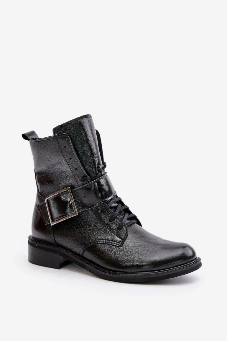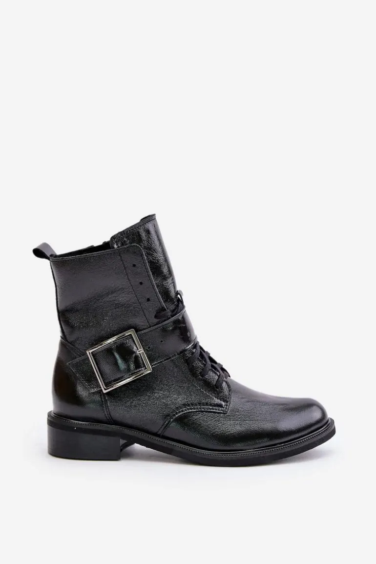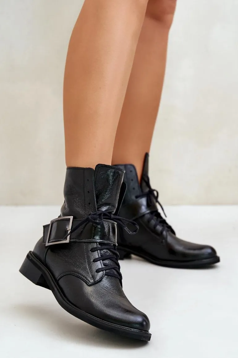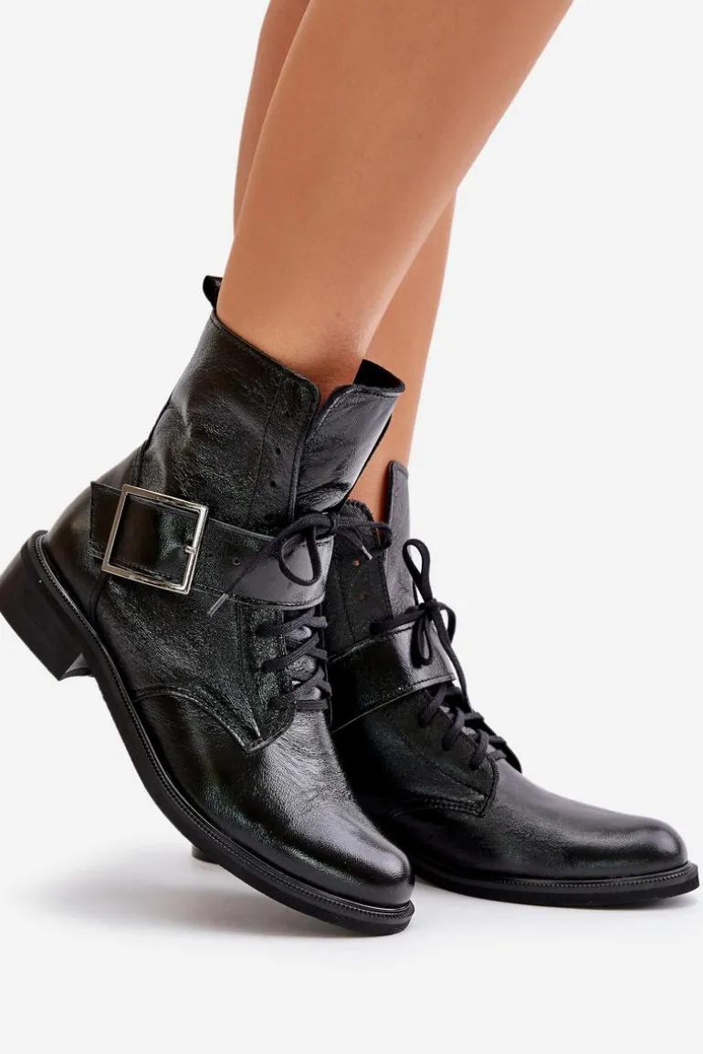Botki damskie wykonane z wysokiej jakości skóry naturalnej. Zapinane na zamek oraz dodatkowo posiadają sznurowanie. Cholewka ozdobiona paskiem ze srebrną klamrą. Miękka wkładka zapewni komfort podczas użytkowania. Noski zaokrąglone. Usztywniony zapiętek zwiększy stabilizację stopy. Przy wyborze rozmiaru prosimy sugerować się tabelą rozmiarów.
