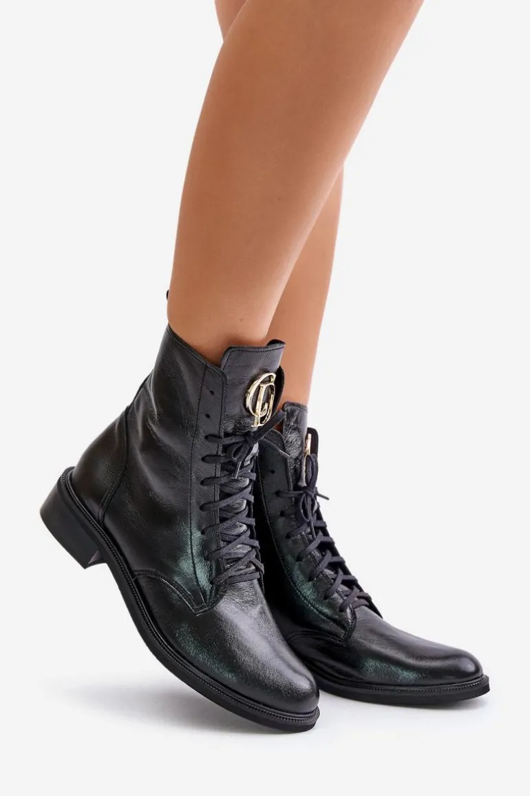 Damskie botki wykonane z wysokogatunkowej skóry naturalnej, które łączą elegancję i funkcjonalność. Model zapinany na zamek z dodatkowym sznurowaniem, co zapewnia idealne dopasowanie do stopy. Na języku umieszczono złoty detal, dodający subtelnego blasku i wyjątkowego charakteru. Przy wyborze rozmiaru prosimy sugerować się tabelą rozmiarów.