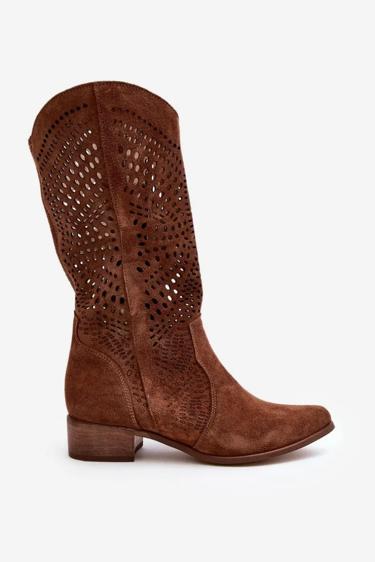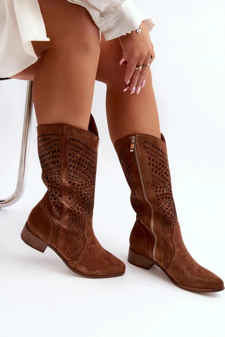 Kozaki-kowbojki zostały wykonane z naturalnego zamszu. Posiadają ażurowy wzorek na cholewce. Model ten zapinany jest na suwak z boku cholewki. Miękka, skórzana wkładka pozwoli na komfortowe użytkowanie obuwia. Dodatkowo kozaki posiadają usztywniany zapiętek. Przy wyborze rozmiaru prosimy sugerować się tabelą rozmiarów.