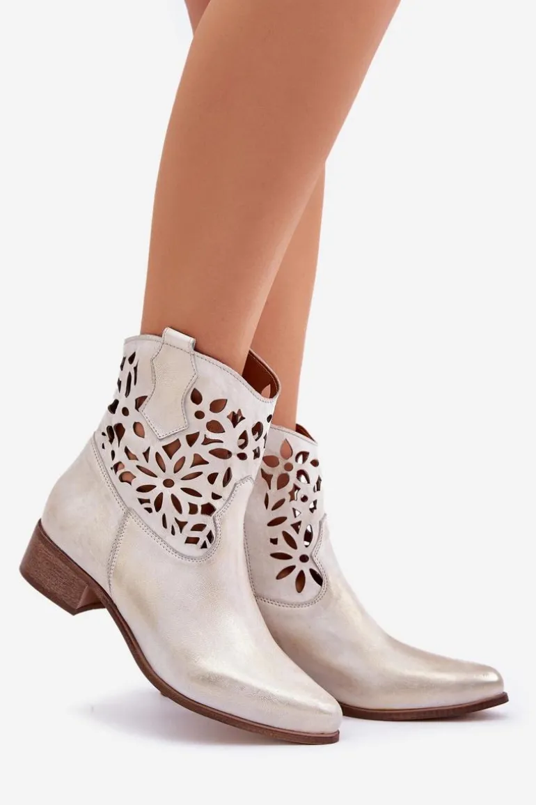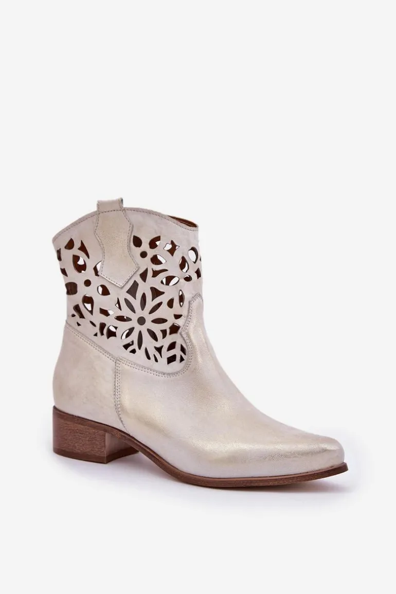 Botki damskie wykonane z naturalnej skóry. Osadzone na niskim obcasie, co sprawia, że są zarówno stylowe, jak i wygodne. Ażurowy wzorek na cholewce dodaje im elegancji. Model ten zapiany jest na zamek, co ułatwia zakładanie obuwia. Miękka wkładka gwarantuje komfort noszenia. Przy wyborze rozmiaru prosimy sugerować się tabelą rozmiarów.