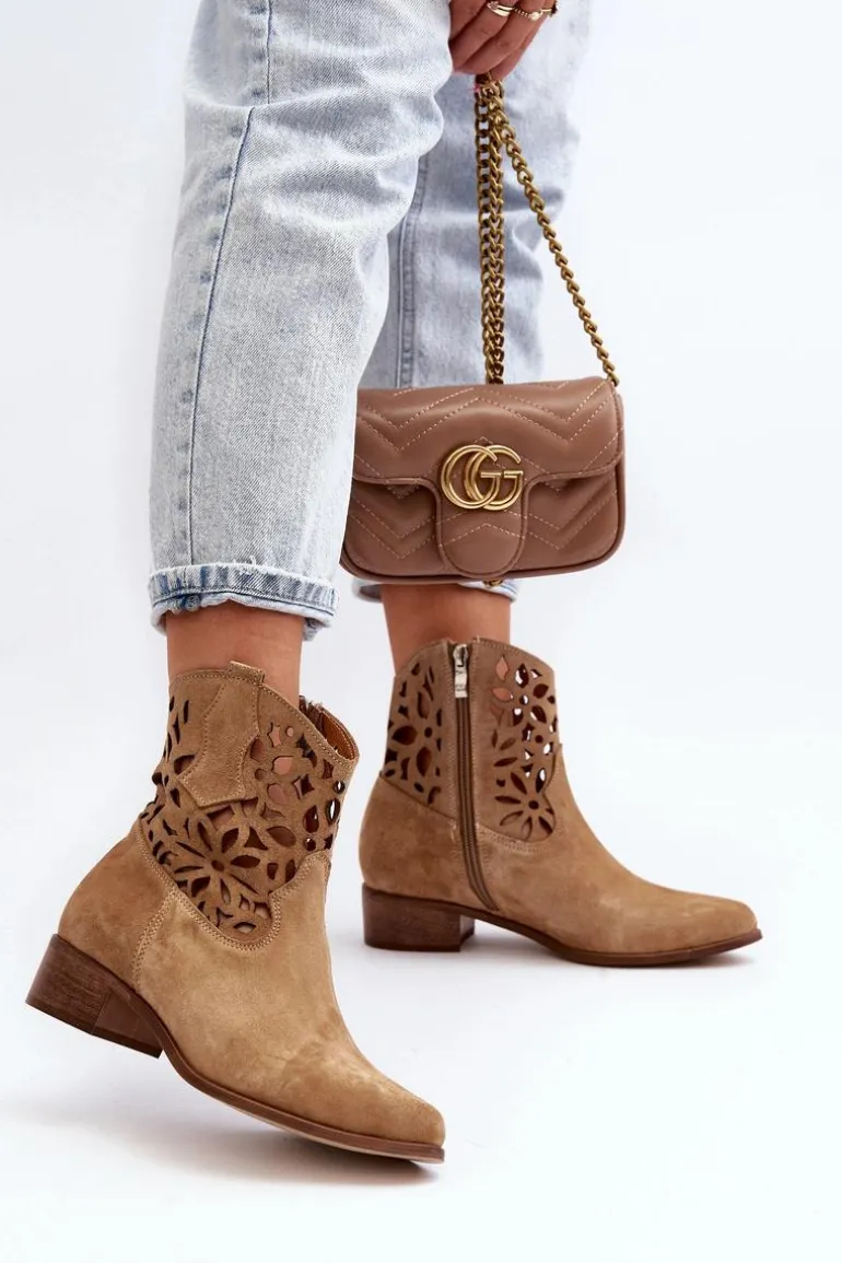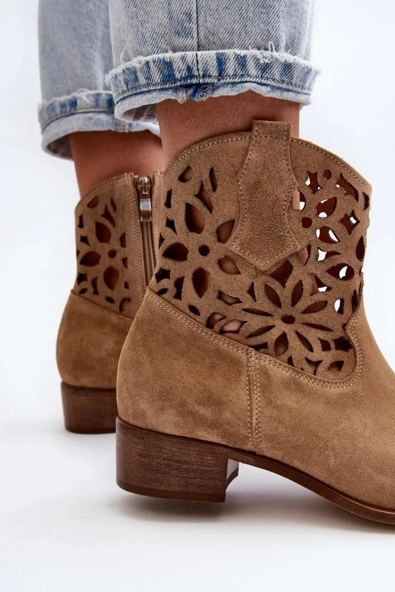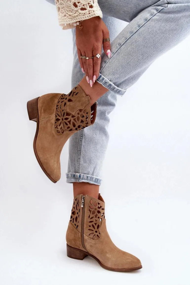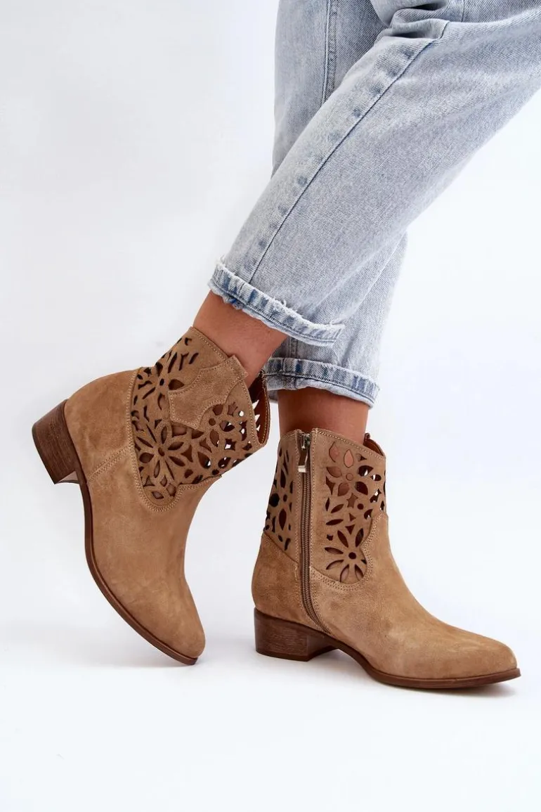 Botki damskie wykonane z naturalnego zamszu. Osadzone na niskim obcasie, co sprawia, że są zarówno stylowe, jak i wygodne. Ażurowy wzorek na cholewce dodaje im elegancji. Model ten zapiany jest na zamek, co ułatwia zakładanie obuwia. Miękka wkładka gwarantuje komfort noszenia. Przy wyborze rozmiaru prosimy sugerować się tabelą rozmiarów.