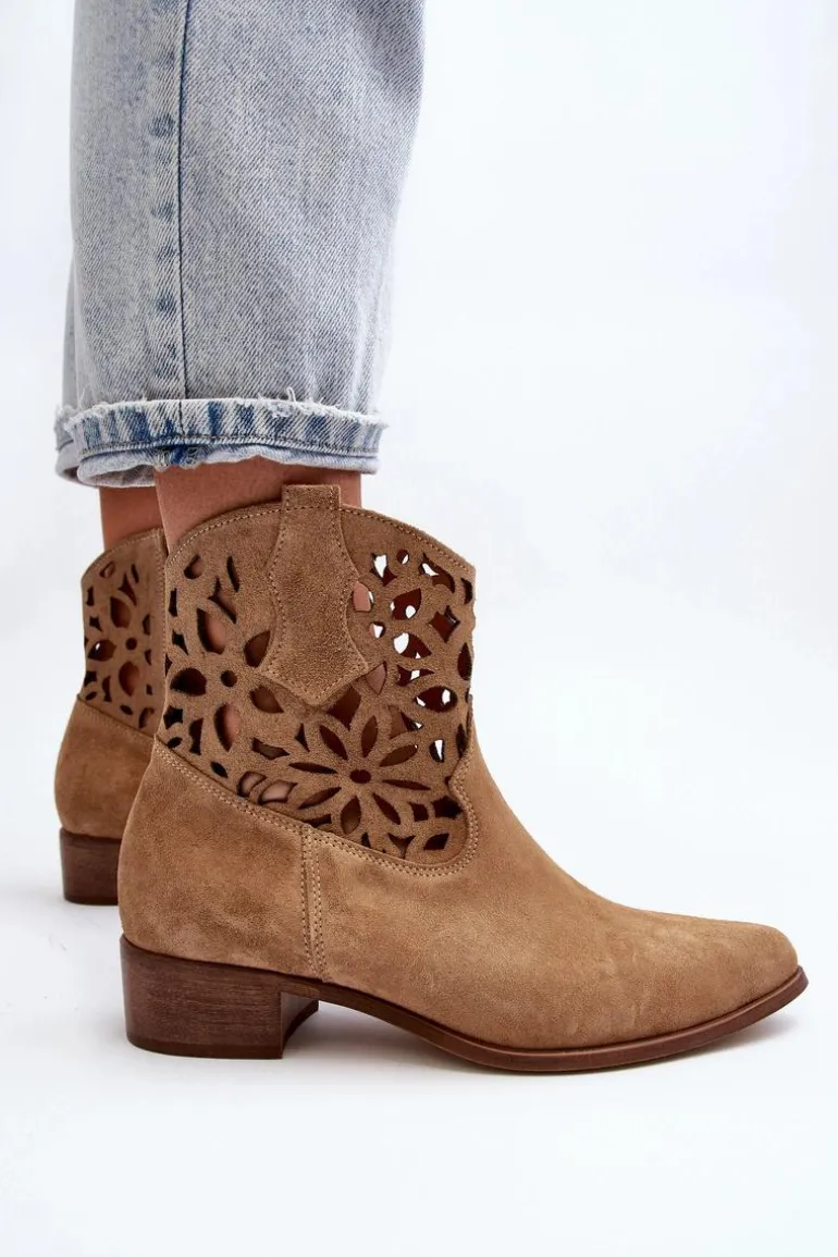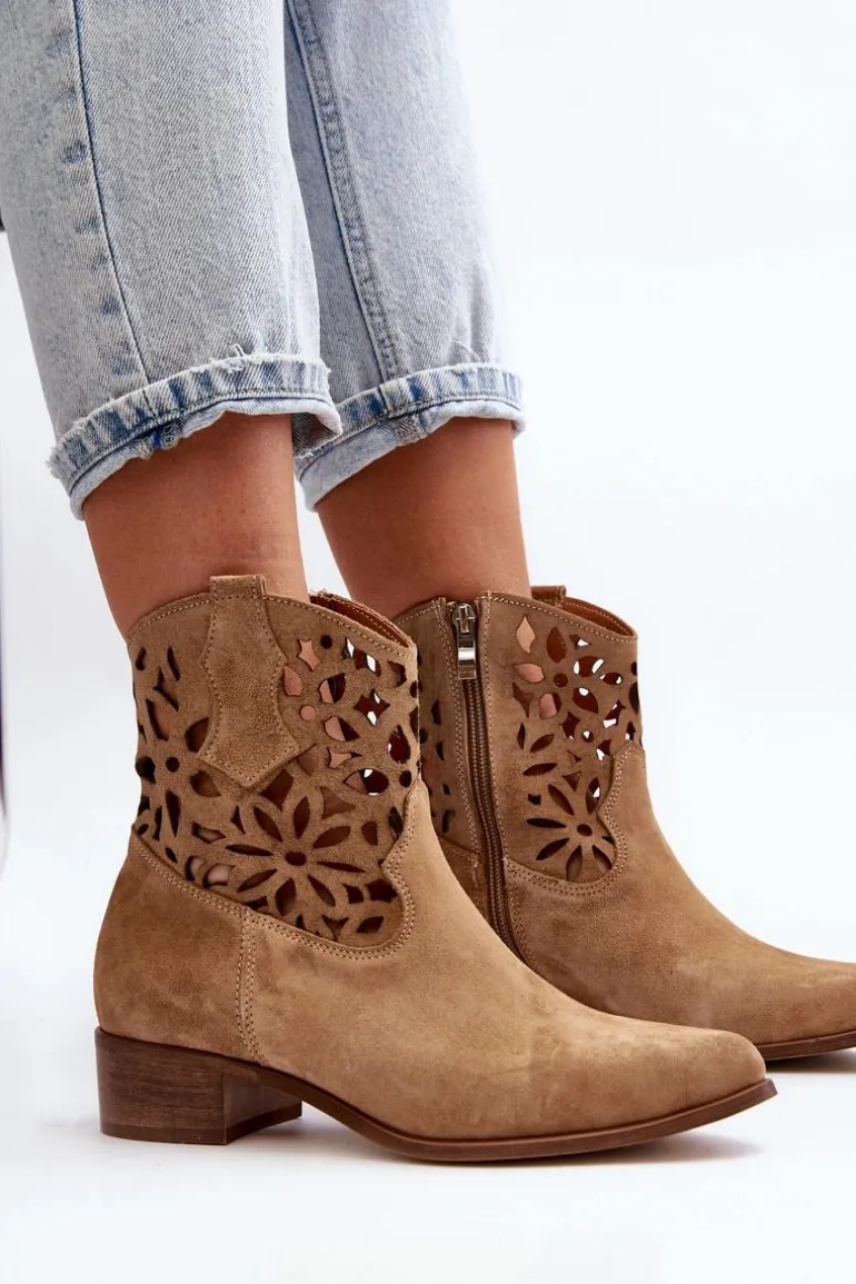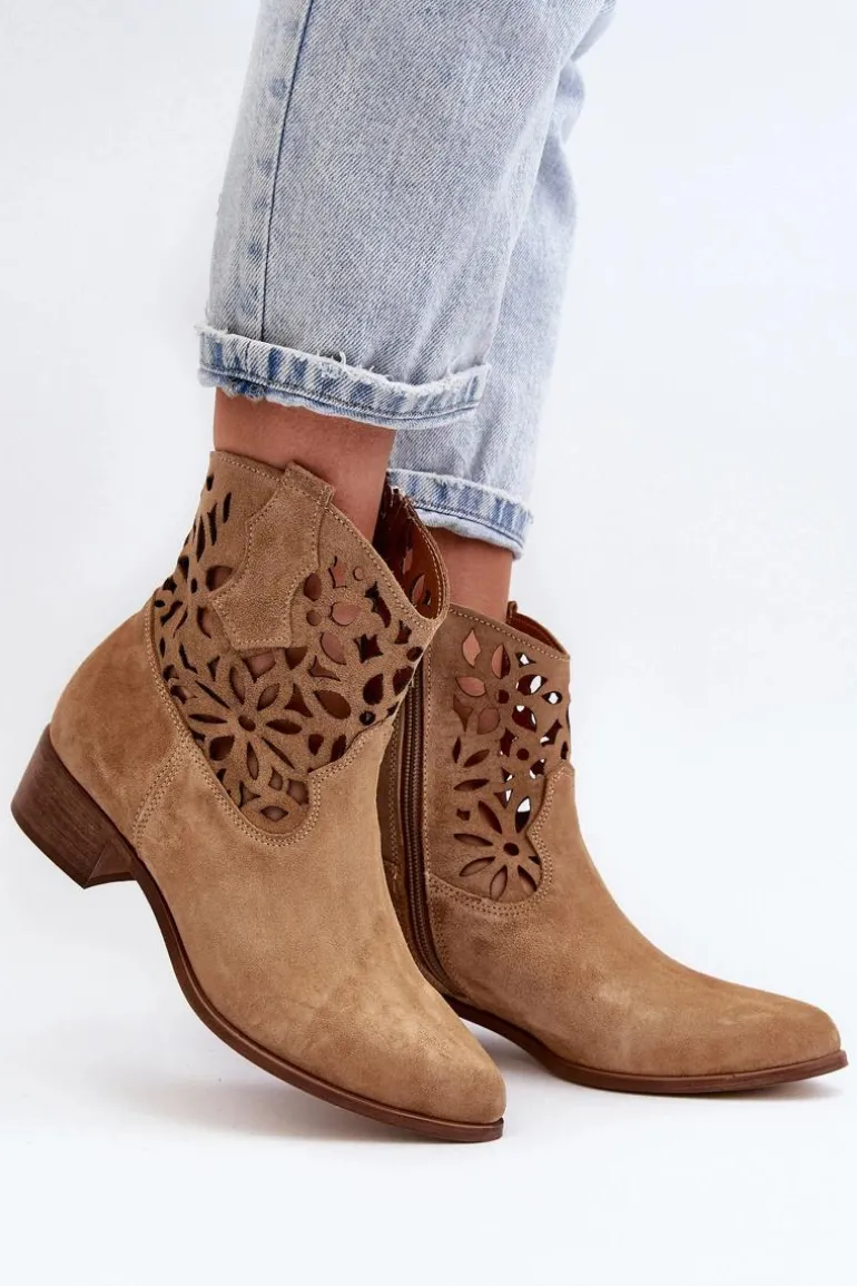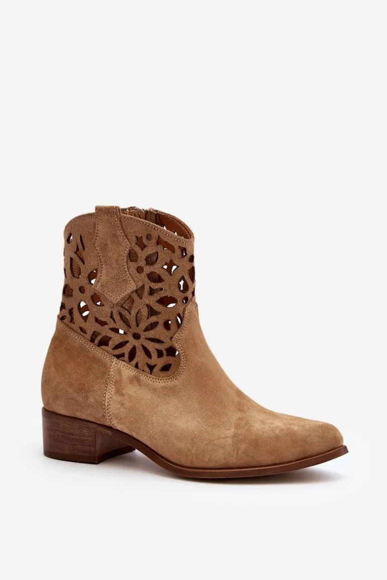 Botki damskie wykonane z naturalnego zamszu. Osadzone na niskim obcasie, co sprawia, że są zarówno stylowe, jak i wygodne. Ażurowy wzorek na cholewce dodaje im elegancji. Model ten zapiany jest na zamek, co ułatwia zakładanie obuwia. Miękka wkładka gwarantuje komfort noszenia. Przy wyborze rozmiaru prosimy sugerować się tabelą rozmiarów.