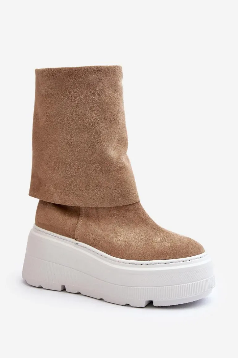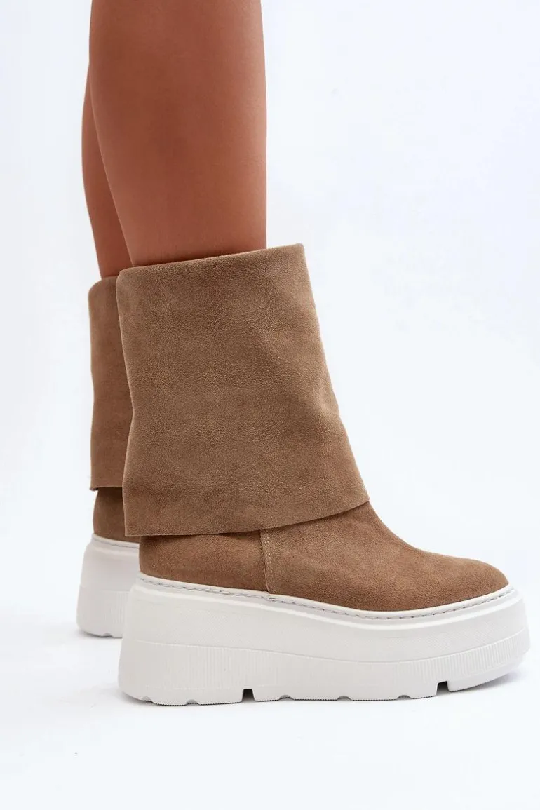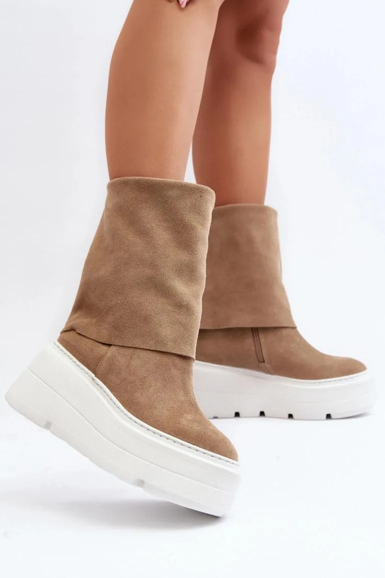 Botki damskie wykonane z naturalnego zamszu. Platforma w tym modelu jest wysoka, jednak botki są niezwykle stabilne. Posiadają zapinanie na zamek od wewnętrznej strony. Noski zaokrąglone. Stylowy fason, który z pewnością dopasujesz do niejednej wiosennej stylizacji! Przy wyborze rozmiaru prosimy sugerować się poniższą tabelą rozmiarów.