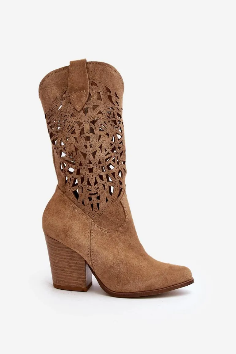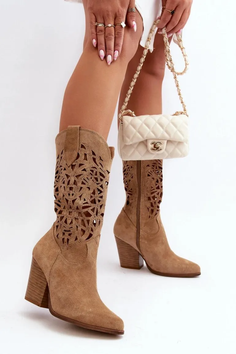 Damskie botki wykonane z naturalnego zamszu. Osadzone na obcasie w postaci słupka. Ażurowy wzorek na cholewce. Zapinane na zamek błyskawiczny. Miękka, niezwykle wygodna wkładka zapewni komfort podczas użytkowania. Noski w szpic optycznie wysmuklą nogi. Koniecznie powinnaś je mieć! Przy wyborze rozmiaru prosimy sugerować się tabelą rozmiarów.
