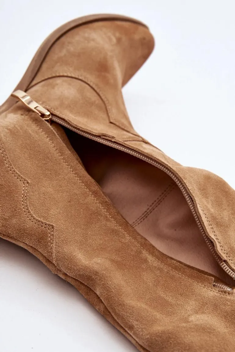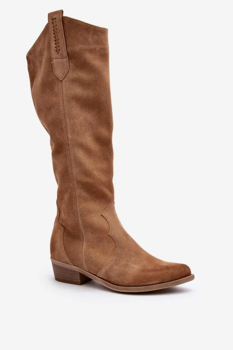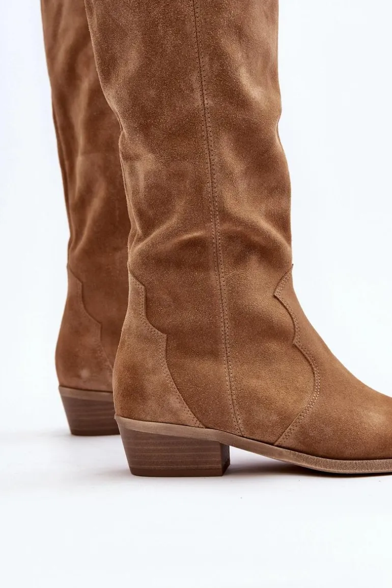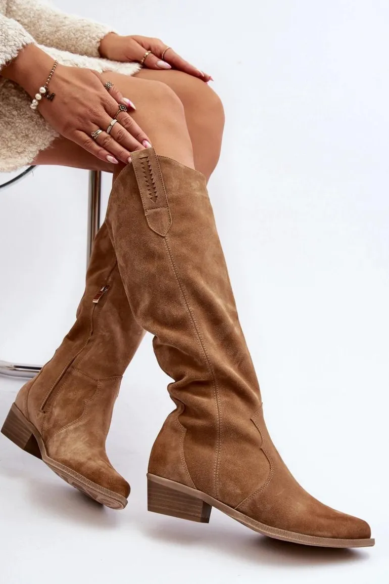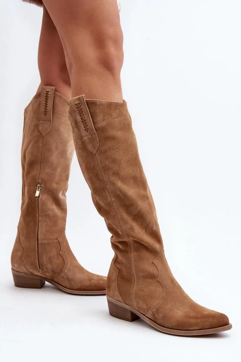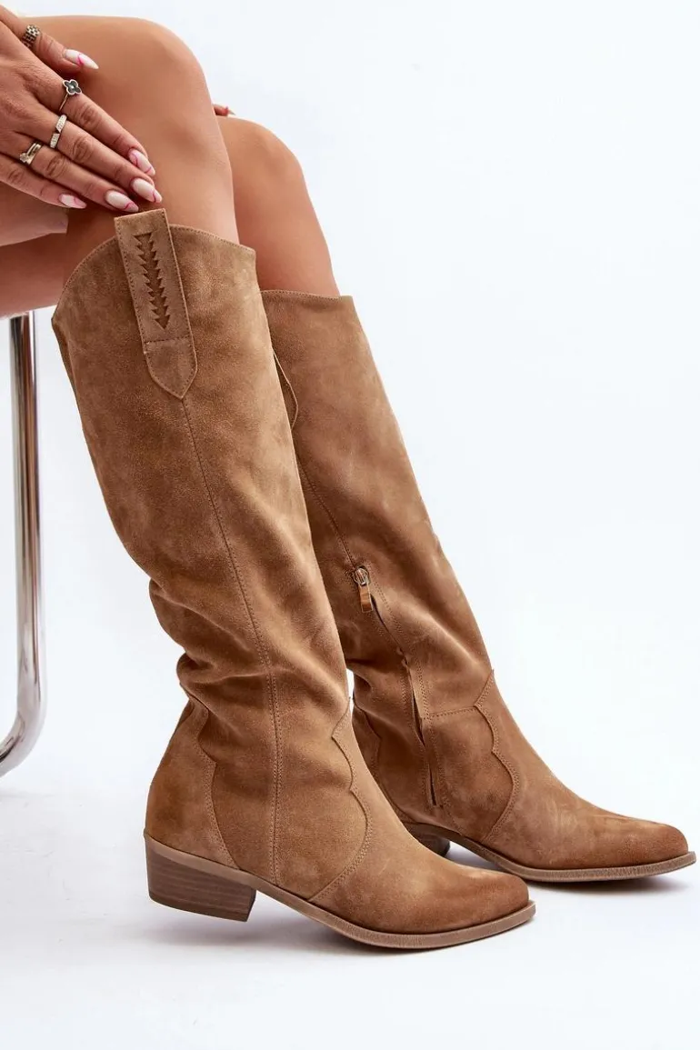 Kozaki damskie w stylu kowbojek to niezwykle modne obuwie na sezon wiosenno-jesienny. Wykonane z naturalnego zamszu. Stabilny, niski obcas sprawia, że są one wygodne i idealne do noszenia na co dzień. Model wsuwany z dodatkowym zapięciem na suwak ułatwia zakładanie butów. Cholewka sięga przed kolano. Skórzana, miękka wkładka zapewnia komfort podczas noszenia. Te kozaki świetnie skomponują się z różnymi stylizacjami. Koniecznie powinny znaleźć się w Twojej garderobie! Przy wyborze rozmiaru prosimy sugerować się tabelą rozmiarów.
