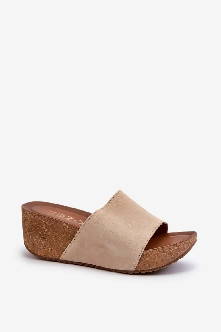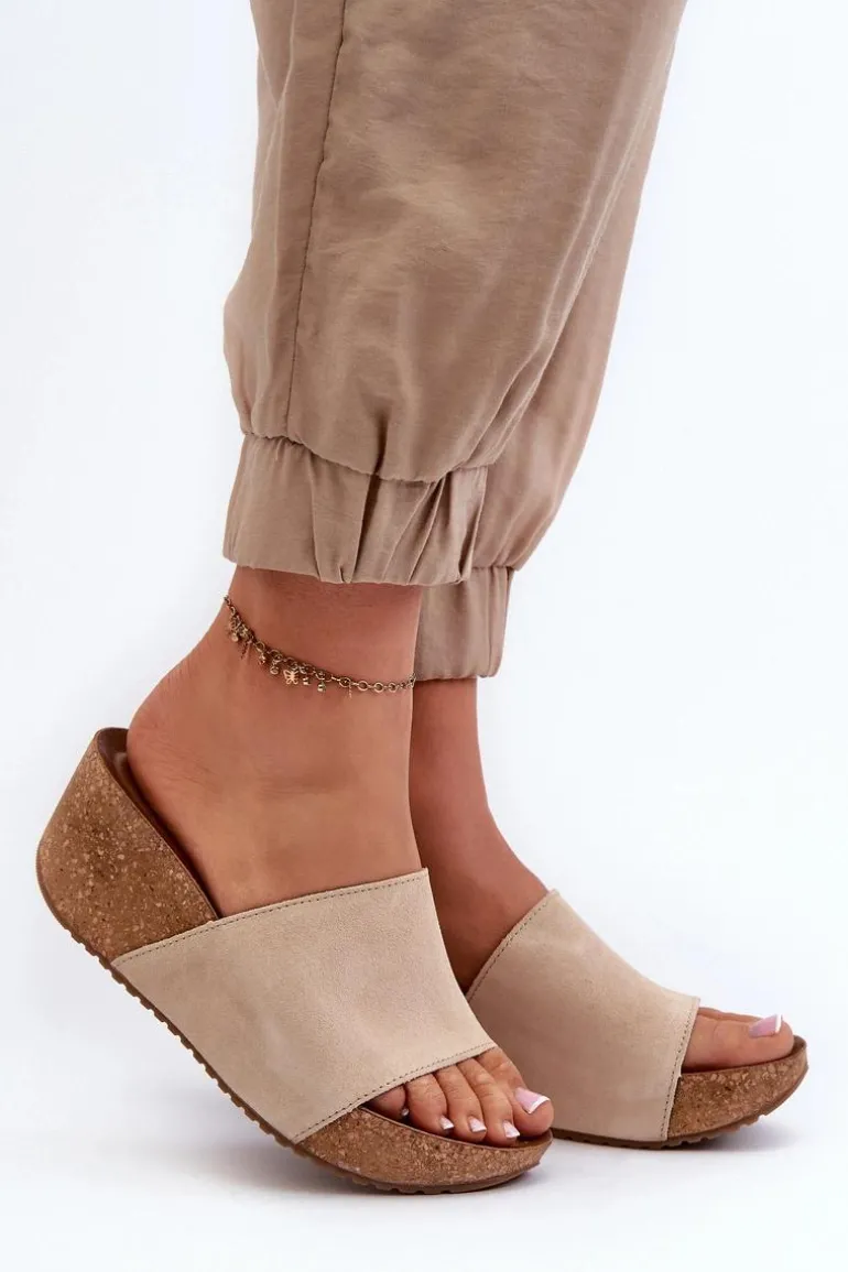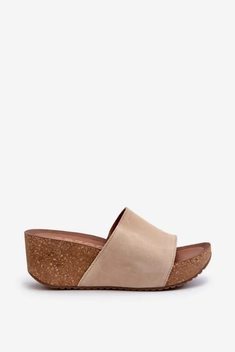 Klapki damskie na korkowym koturnie. Wykonane z wysokiej jakości naturalnego zamszu, zapewniają trwałość i komfort noszenia. Modny fason, który będzie idealnym wyborem na letnie dni. Przy wyborze rozmiaru prosimy sugerować się tabelą rozmiarów.