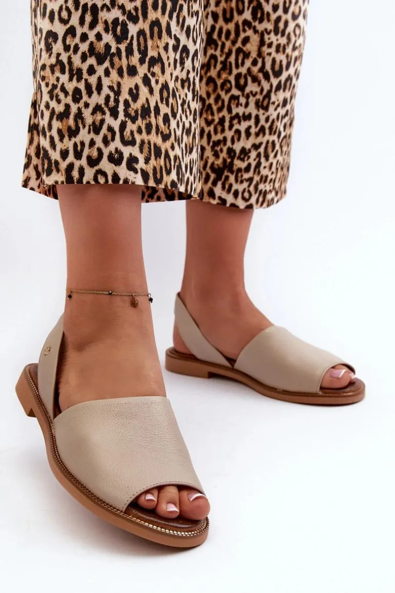 Wsuwane sandałki damskie zostały wykonane z wysokiej jakości naturalnej skóry. Osadzone na płaskim obcasie ze zdobieniami przy podeszwie. Sandałki posiadają odkrytą piętę i palce. Miękka, skórzana wkładka zapewni wygodne użytkowanie. Sandałki są wsuwane, a ich tylna część cholewki jest delikatnie usztywniona. Przy wyborze rozmiaru prosimy kierować się tabelą rozmiarów.
