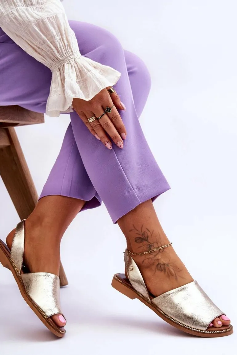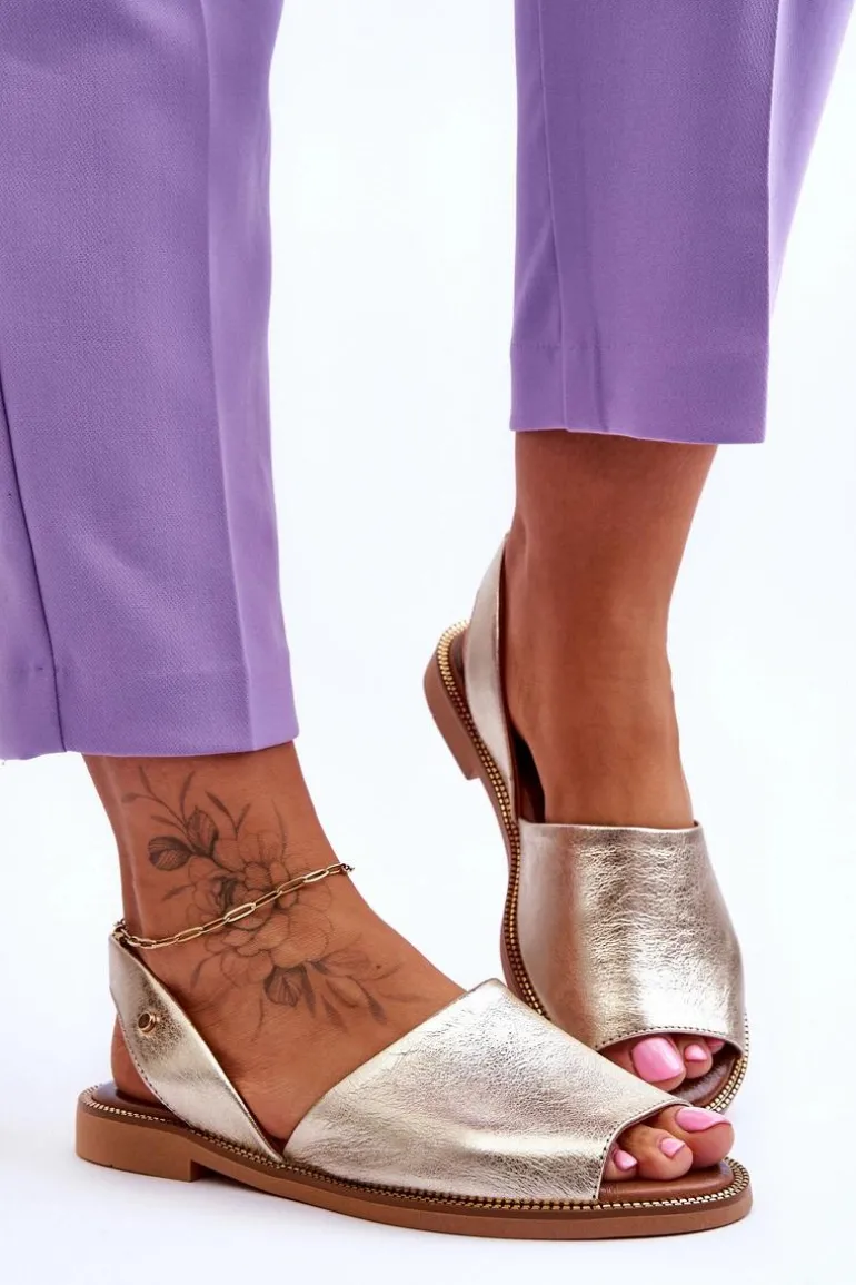 Wsuwane sandałki damskie zostały wykonane z wysokiej jakości naturalnej skóry. Osadzone na płaskim obcasie ze zdobieniami przy podeszwie. Sandałki posiadają odkrytą piętę i palce. Miękka, skórzana wkładka zapewni wygodne użytkowanie. Sandałki są wsuwane, a ich tylna część cholewki jest delikatnie usztywniona. Przy wyborze rozmiaru prosimy kierować się tabelą rozmiarów.