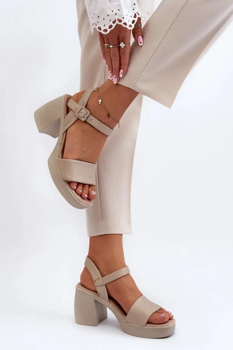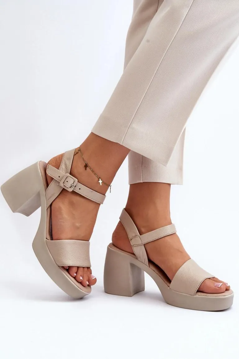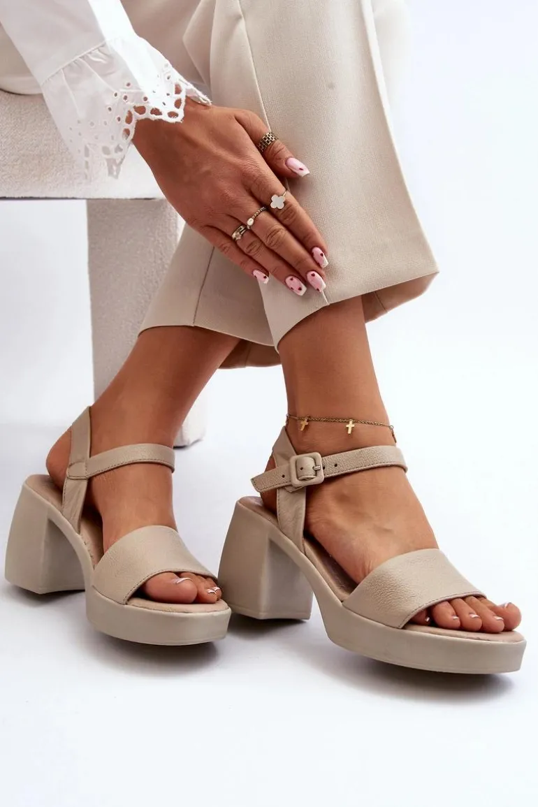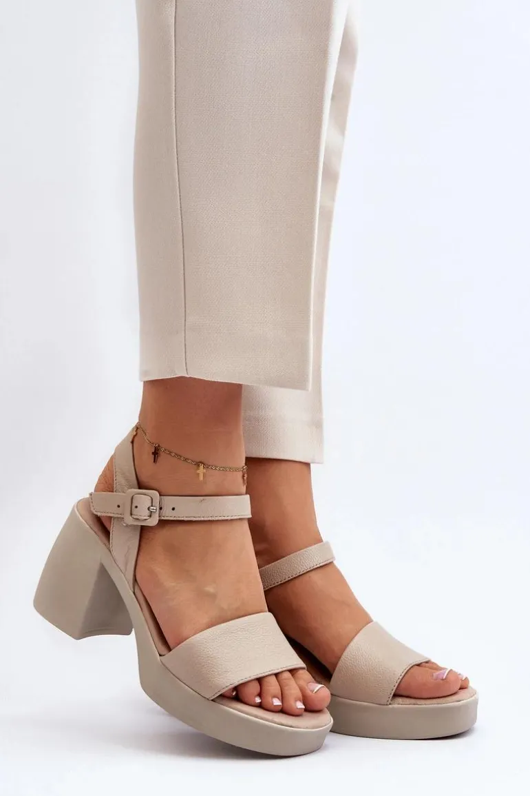 Damskie sandały wykonane z wysokiej jakości skóry naturalnej. Osadzone na masywnym obcasie w postaci klocka. Model ten zapinany jest na regulowany pasek ze sprzączką. Miękka, skórzana wkładka zapewni wygodę podczas użytkowania. Idealne do letnich sukienek, spódnic oraz spodni. Koniecznie powinnaś je mieć! Przy wyborze rozmiaru prosimy sugerować się tabelą rozmiarów.
