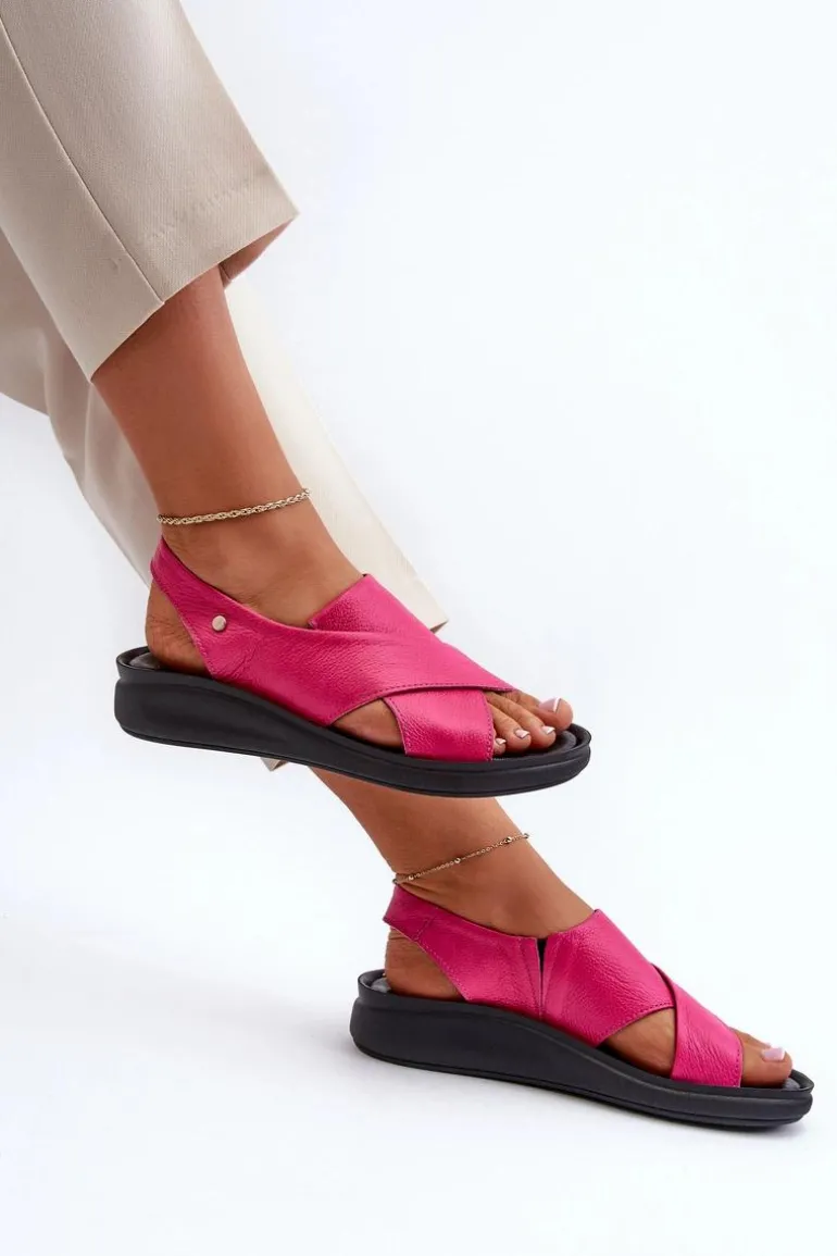 Te sandałki damskie to połączenie wygody i stylu, które z pewnością przypadnie Ci do gustu! Wykonane z naturalnej skóry, zapewniają trwałość i komfort noszenia. Model wsuwany, z dodatkową gumką. Ozdobny emblemat z boku cholewki dodaje im wyjątkowego charakteru, nadając im subtelny, elegancki akcent. Sandały zostały osadzone na platformie oraz lekkim koturnie, co nie tylko dodaje im stylowego wyglądu, ale także zapewnia stabilność i komfort podczas chodzenia. Model ten jest niezwykle praktycznym i modnym dodatkiem do letniej garderoby, idealnym zarówno na codzienne spacery, jak i na bardziej formalne okazje. Przy wyborze rozmiaru prosimy kierować się tabelą rozmiarów.