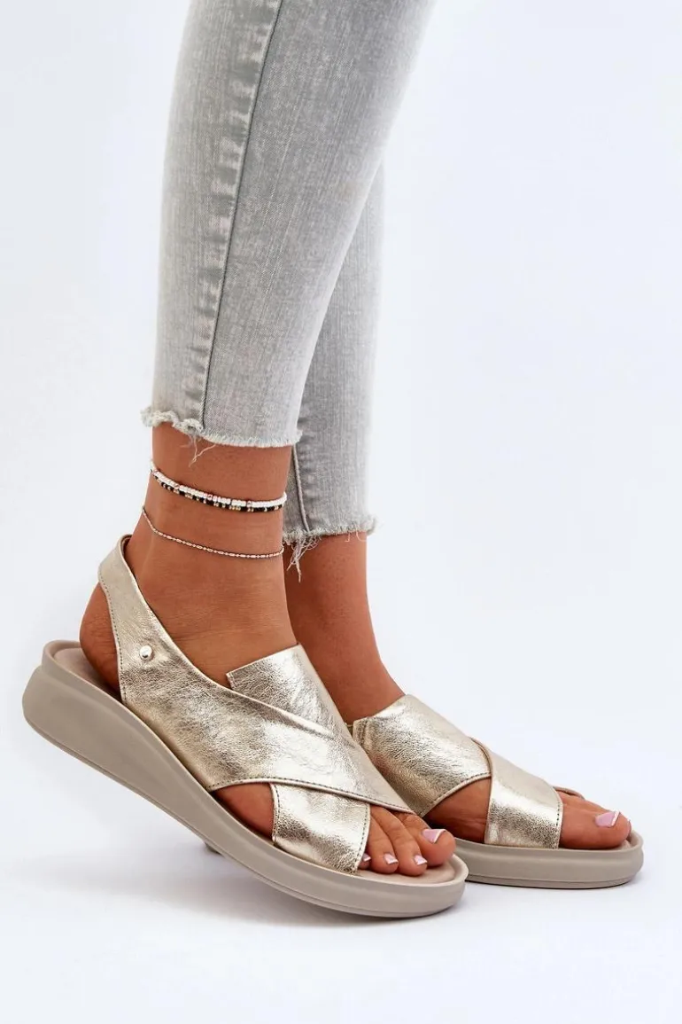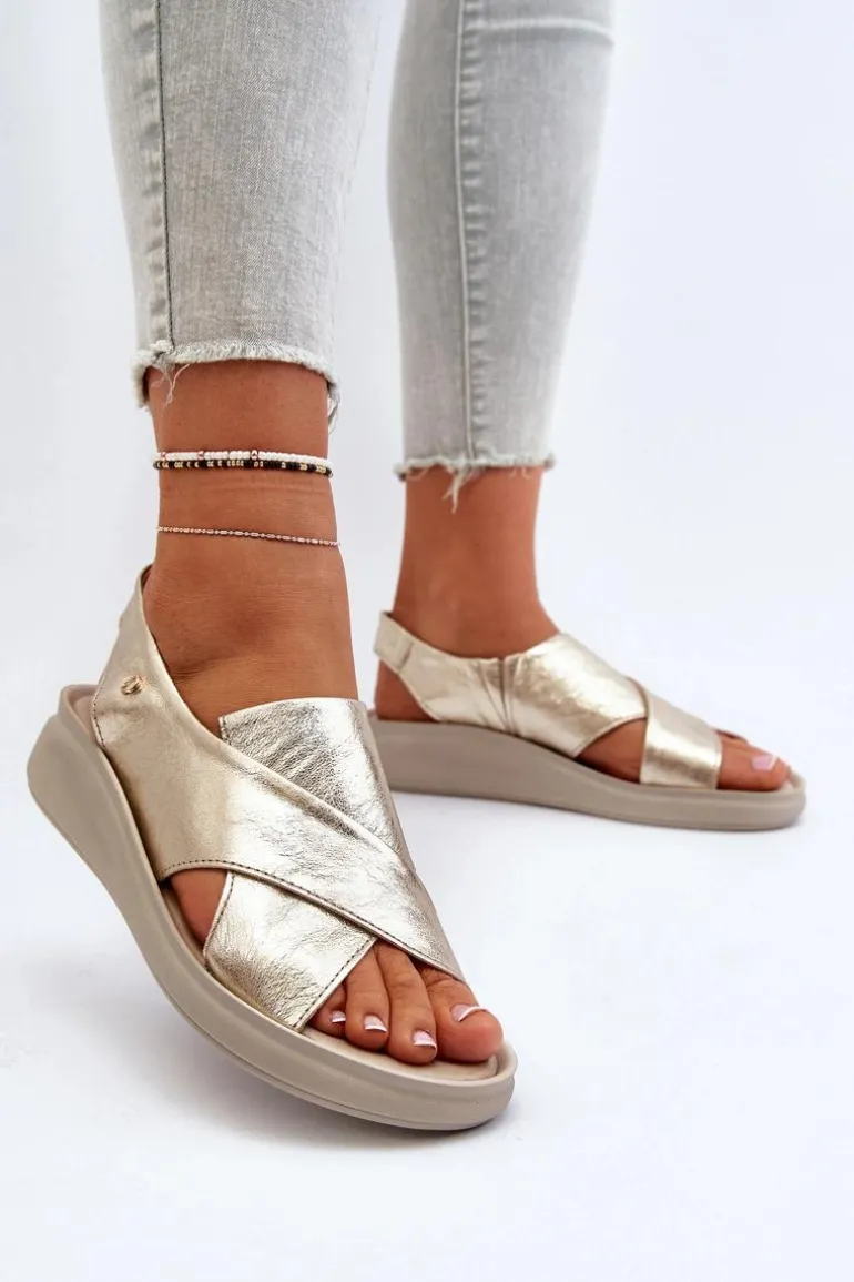 Te sandałki damskie to połączenie wygody i stylu, które z pewnością przypadnie Ci do gustu! Wykonane z naturalnej skóry, zapewniają trwałość i komfort noszenia. Model wsuwany, z dodatkową gumką. Ozdobny emblemat z boku cholewki dodaje im wyjątkowego charakteru, nadając im subtelny, elegancki akcent. Sandały zostały osadzone na platformie oraz lekkim koturnie, co nie tylko dodaje im stylowego wyglądu, ale także zapewnia stabilność i komfort podczas chodzenia. Model ten jest niezwykle praktycznym i modnym dodatkiem do letniej garderoby, idealnym zarówno na codzienne spacery, jak i na bardziej formalne okazje. Przy wyborze rozmiaru prosimy kierować się tabelą rozmiarów.