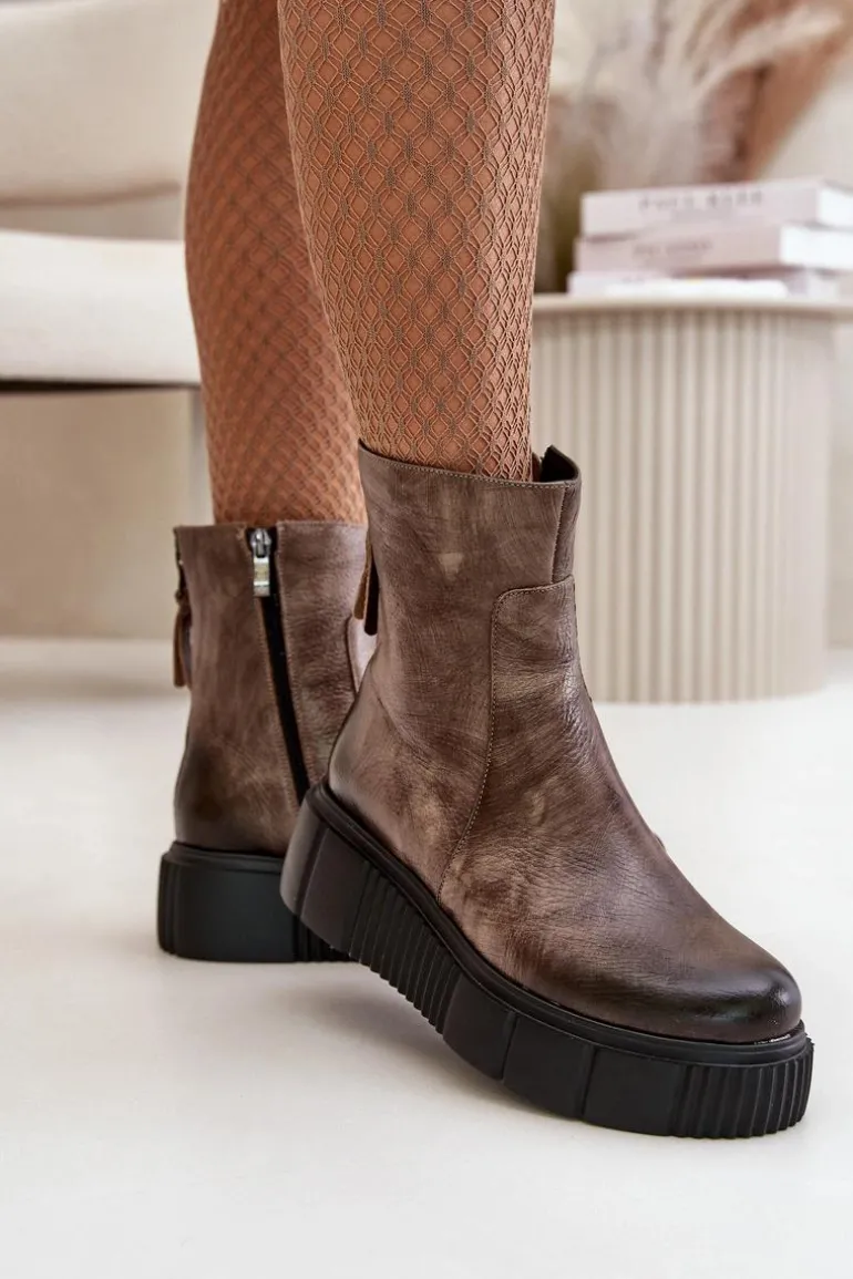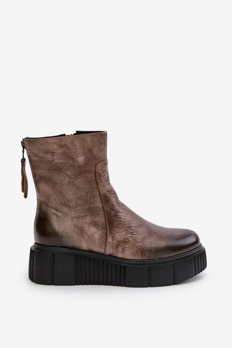 Botki damskie zostały wykonane z wysokiej jakości naturalnych skór. Osadzone na masywnej platformie z delikatnym koturnem. Zapinane z boku cholewki na suwak, natomiast suwak z tyłu jest ozdobny. Dodatkowo botki posiadają usztywniany zapiętek. Ocieplone w środku filcem. Model ten na pewno sprawdzi się w wielu jesiennych stylizacjach! Przy wyborze rozmiaru prosimy kierować się tabelą rozmiarów